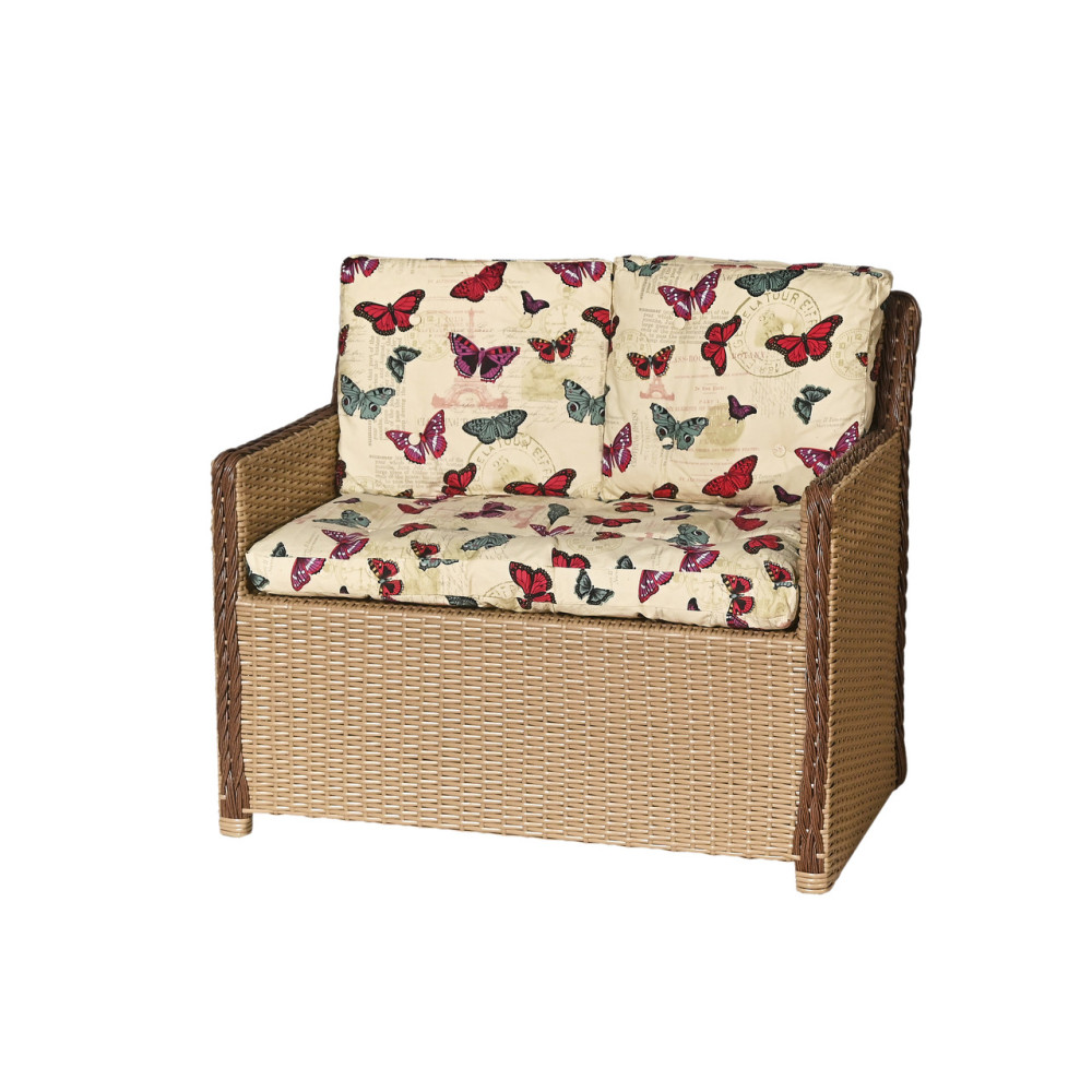 Двомісний ротанговий диван Офелія. Плетіння 2-х кольорів - ніжно бежевого та насиченого шоколадного ідеально доповнять будь-який інтер'єр. Диван з ротангу легкий у догляді, не деформується при використанні. Він виготовлений із штучного ротангу, який стійкий до сонячних променів, перепадів температур та вологості. В основі дивану лежить металевий каркас.
