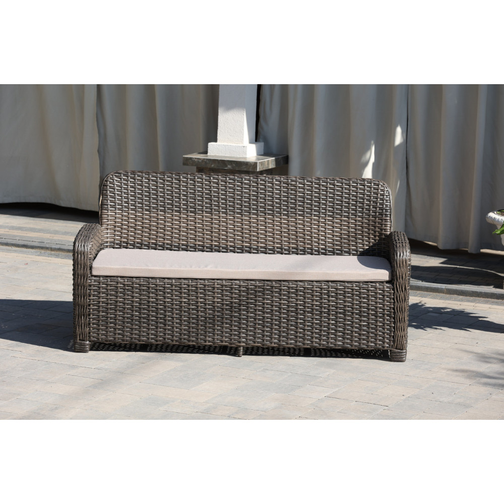 Стильний диван Амелія має зручні пологі підлокітники, що добре підтримують руку. В комплекті надається подушка, яка гарантовано забезпечить максимум релаксу і дозволить відпочити по-справжньому. Диван виготовлений зі штучного ротангу, який стійкий до УФ-променів, різких перепадів температур та зміни вологості, не деформується при використанні, легкий у догляді. Основа дивану - металевий каркас.