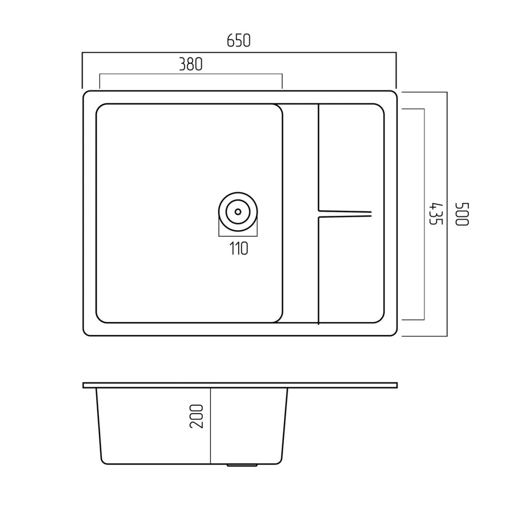 Завдяки своїм компактним розмірам - довжина 650 мм і ширина 500 мм,глибина 200мм- ця мийка ідеально підходить для невеликих кухонь, де кожен дюйм простору цінний. Квадратна форма додає сучасності та гармонію у дизайні.Розмір чаші 380х435х200мм.