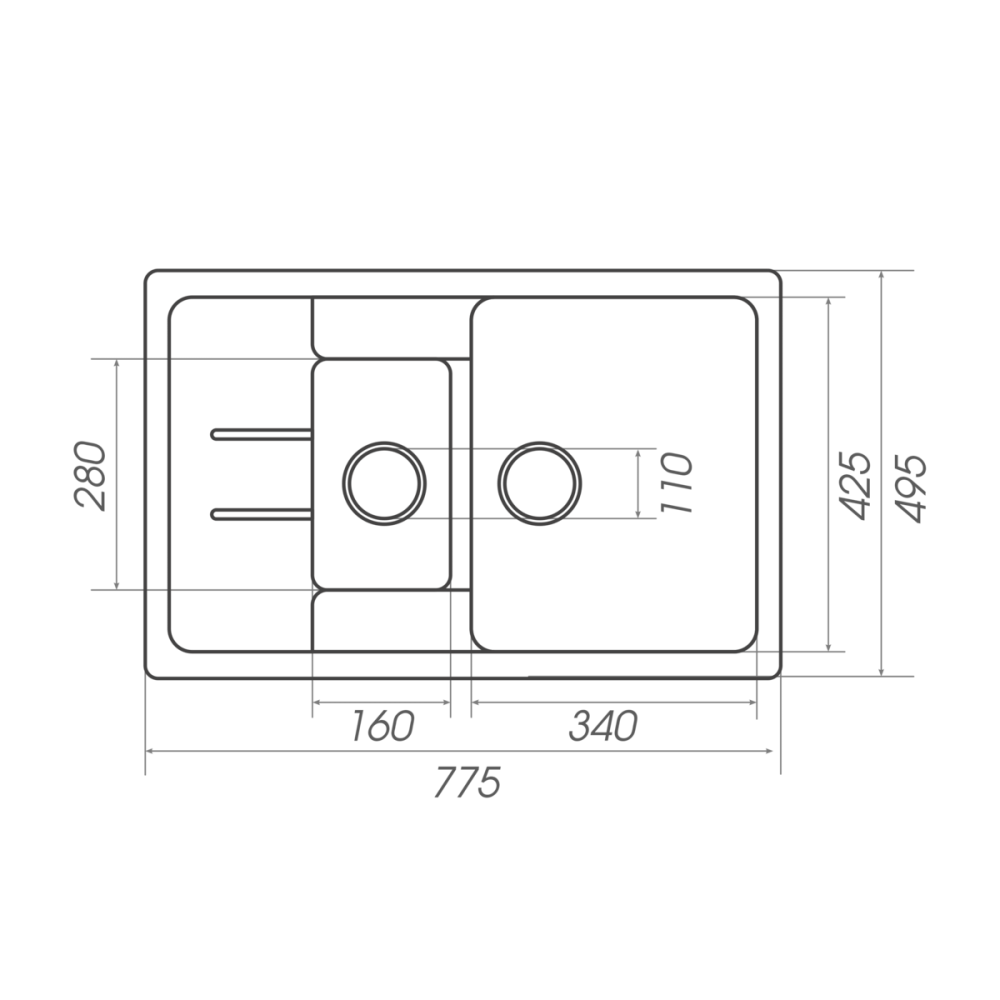 Розміри мийки – 775x495х190 мм, вага – 13.5 кг, сифон – євросифон з широкою горловиною, 110 мм.