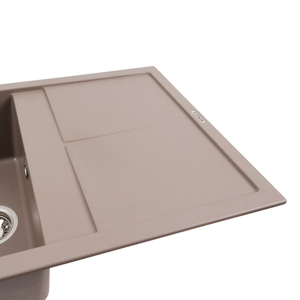 Гранітна мийка для кухні 7950 SELENA українського бренду Platinum - це стильна, врізна, прямокутна мийка, яка своїм виглядом чудово доповнить дизайн вашої кухні. Мийка на 80% складається з кварцу та на 20% з надзвичайно твердої акрилової смоли, завдяки чому невибаглива у догляді, а також має великий запас міцності. Розміри чаші, 377x430x200 мм, роблять її дуже місткою та зручною у використанні. Монтаж здійснюється врізним способом у кухонну шафу шириною не менше 500 мм. Мийка має матову фактуру і приємний для ока колір-Дюна що дозволяє їй легко вписатися в інтер'єр кухні. Мийка виготовлена в Україні із якісної німецької сировини за технологією Solid Surface з дотриманням усіх необхідних стандартів.