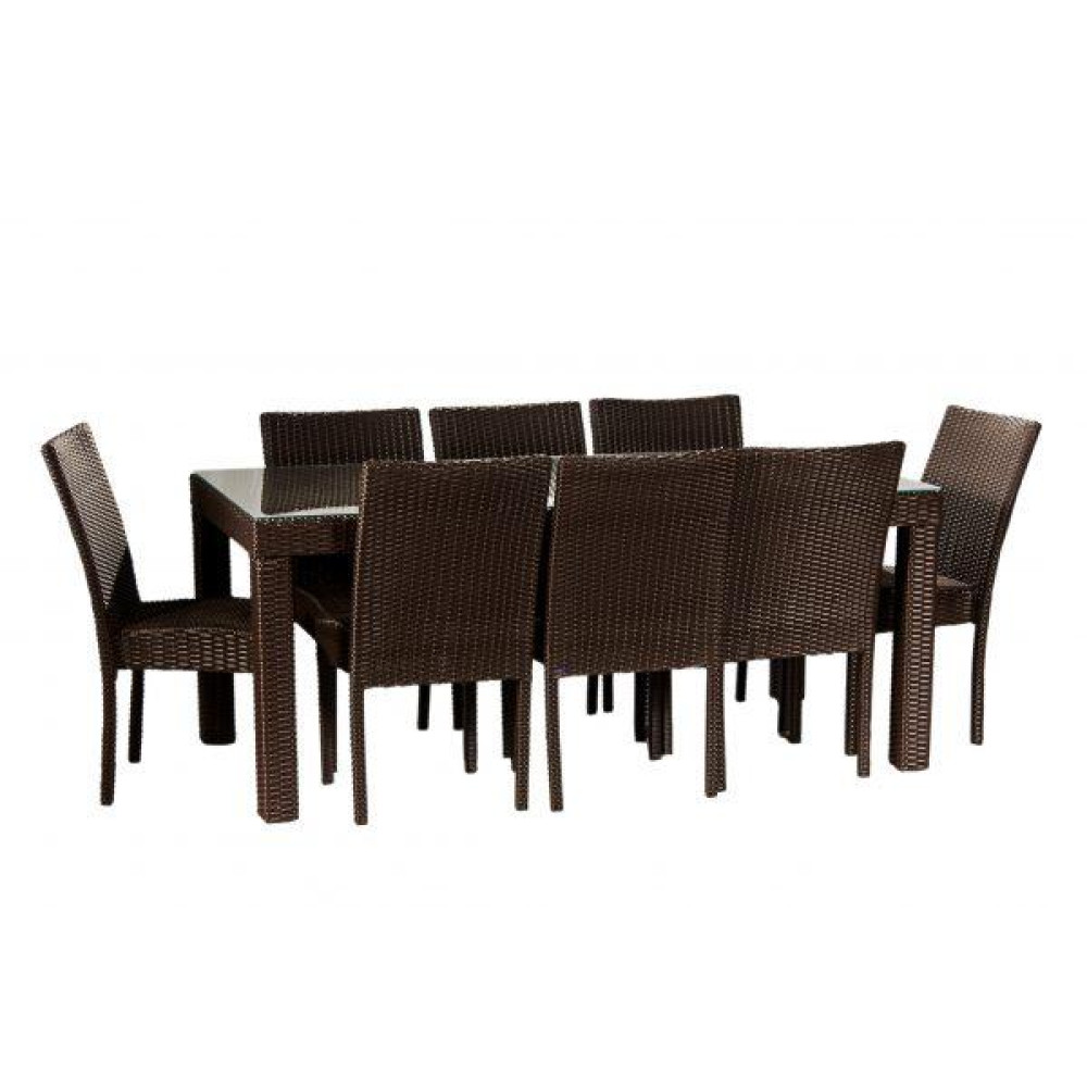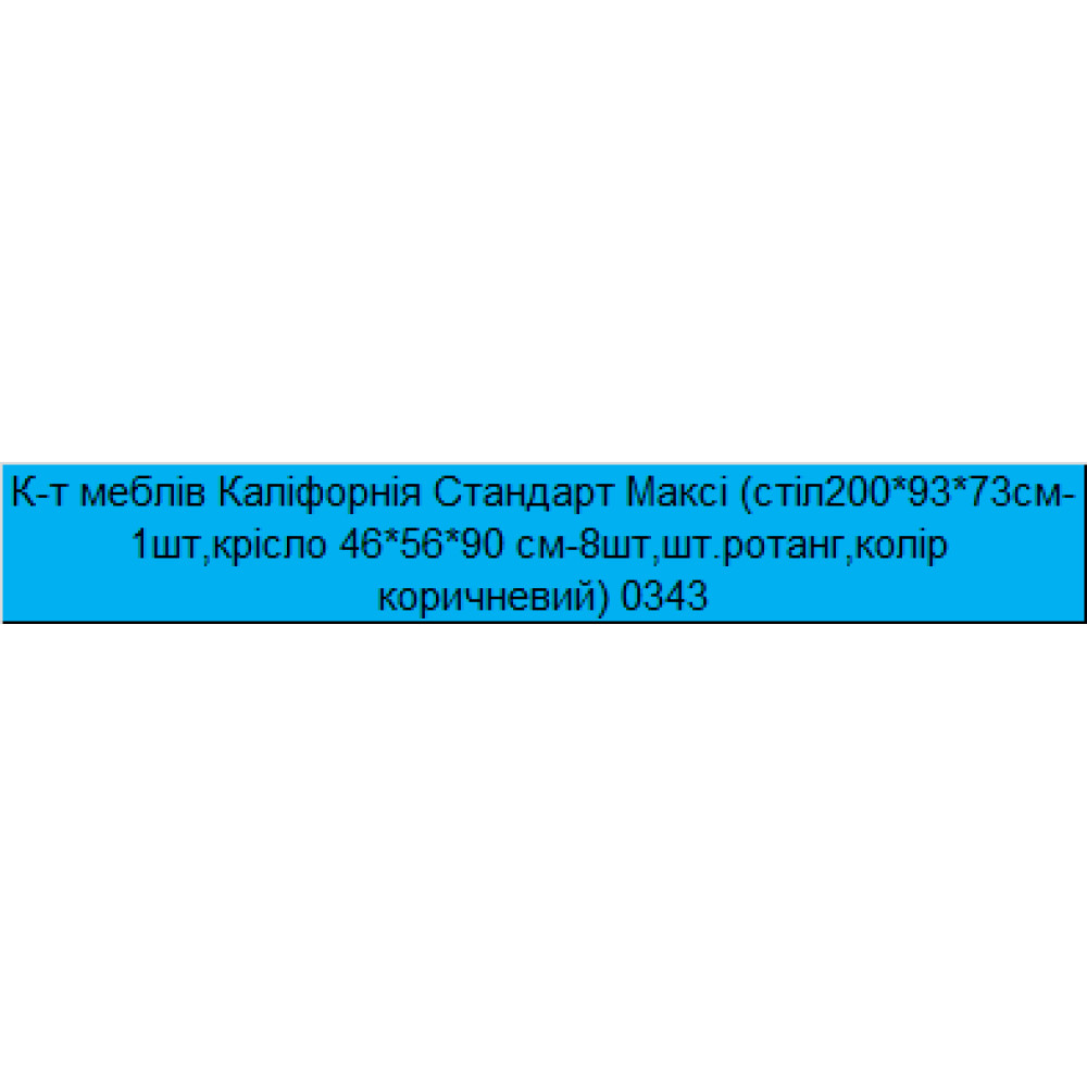 КАЛІФОРНІЯ МАКСІ - комплект садових меблів з ротанга для компанії друзів і великої родини. У наборі великий прямокутний стіл, покритий прозорим склом і 8 крісел без підлокітників. Комплект виготовлений з штучного ротанга, стійкого до УФ випромінювання, різких перепадів температури і вологості, не деформується при експлуатації, легко обслуговується.