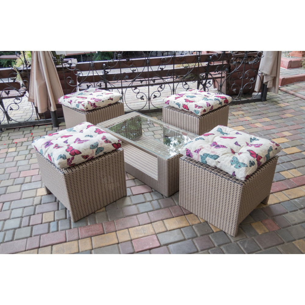 Комплект садових меблів із ротангу РІО. У набір входить стіл та 4 пуфи. Меблі прослужать Вам довго, адже виготовлені із матеріалу, який стійкий до погодних умов, не просідає, не піддається впливу сонячних променів. Основа меблів на металевий каркас. Ротанговий стіл покритий прозорим склом, для підвищення комфорту до пуфів додаються подушки.
