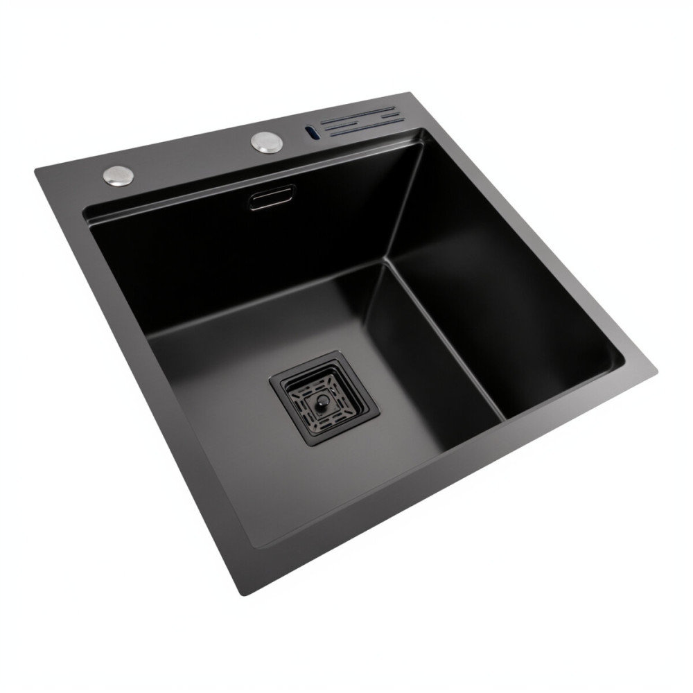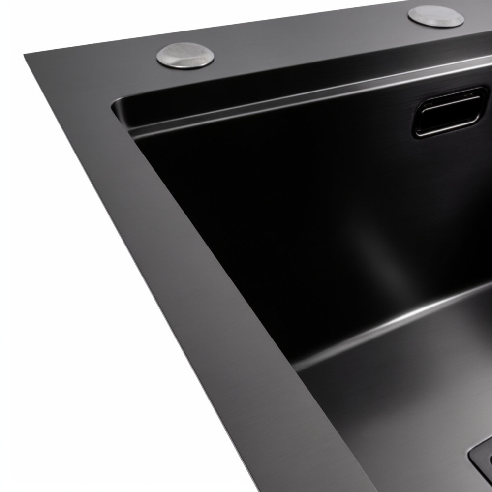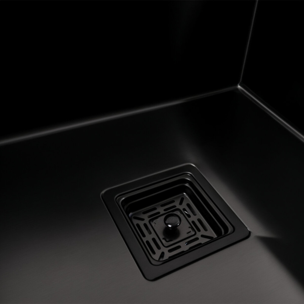 Розмір мийки 500х500х230мм, а чаші - 425×360×230 мм, що робить її ідеальною для різноманітних кухонь. Виготовлена з високоякісної нержавіючої сталі SUS 201 з PVD покриттям, вона не тільки стійка до корозії, але і має чорний Platinum Handmade дизайн, який додає елегантності вашій кухні.