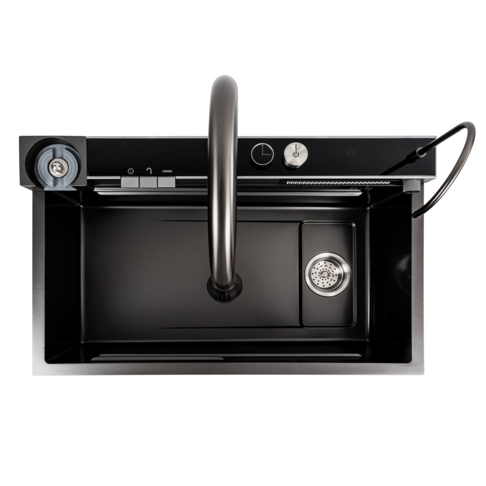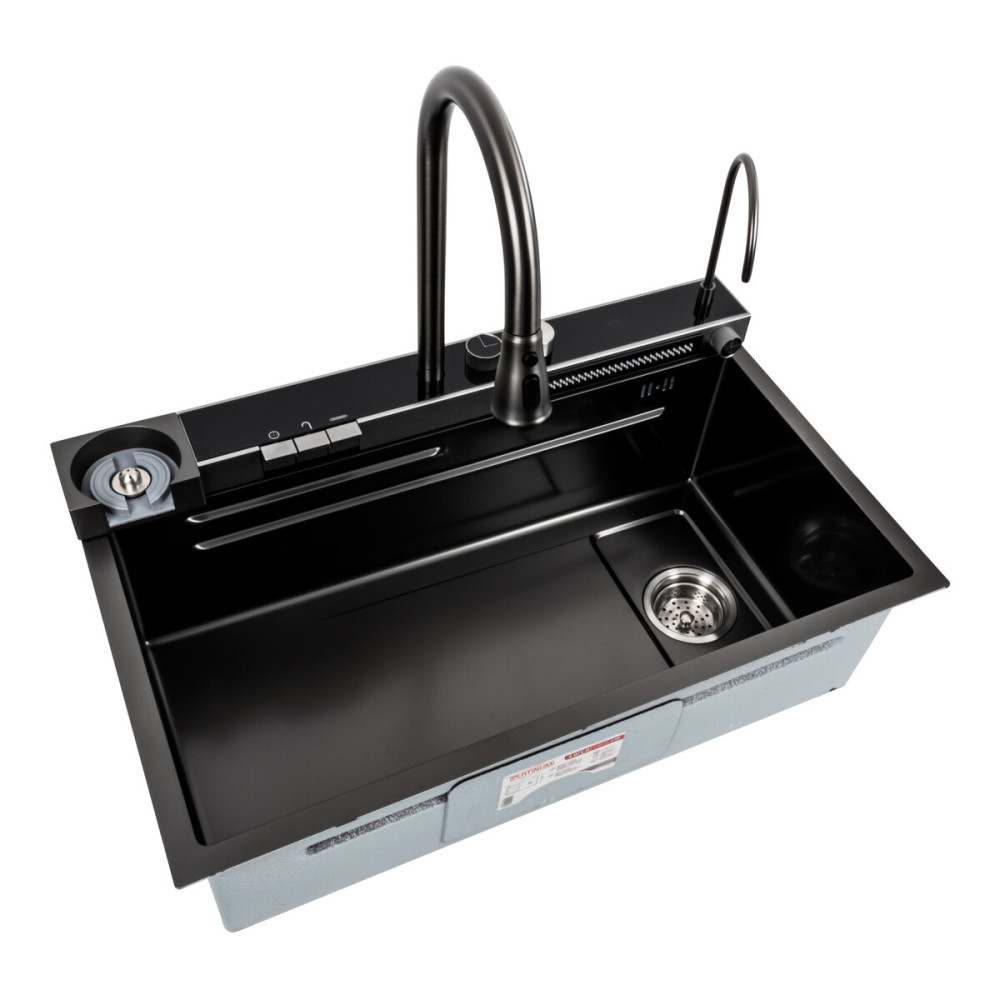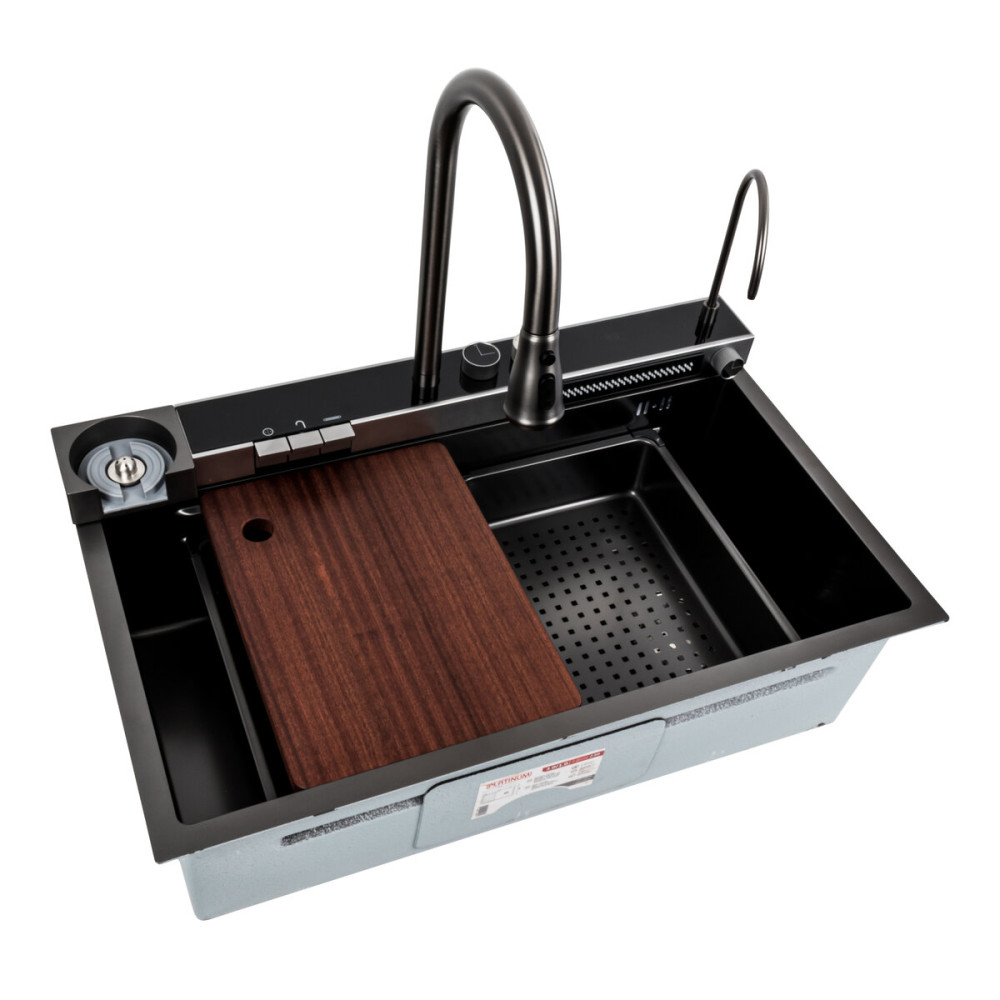 Кухонна мийка 75*45 PVD чорна Platinum Handmade "ВОДОСПАД" - неймовірно популярна кухонна мийка ,справжнє відкриття ! Її багатофункціональність і комплектація зі змішувачем роблять її незамінним аксесуаром для будь-якої кухні.
