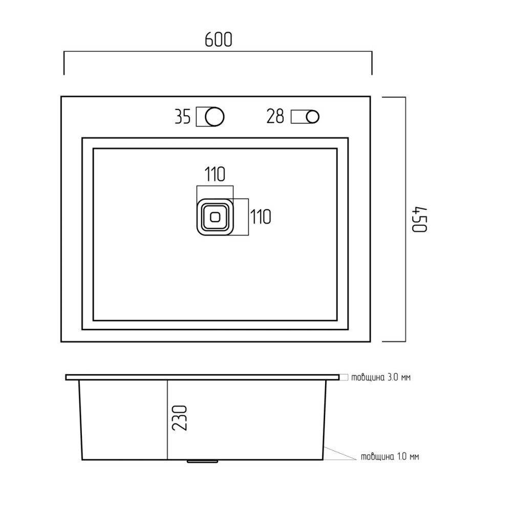 Мийка має чашу глибиною 230 мм, що забезпечує зручність щоденного використання. Тип встановлення – універсальний, як на стільницю так і під стільницю. Для монтажу мийки потрібна ширина стільниці не менше 500 мм.