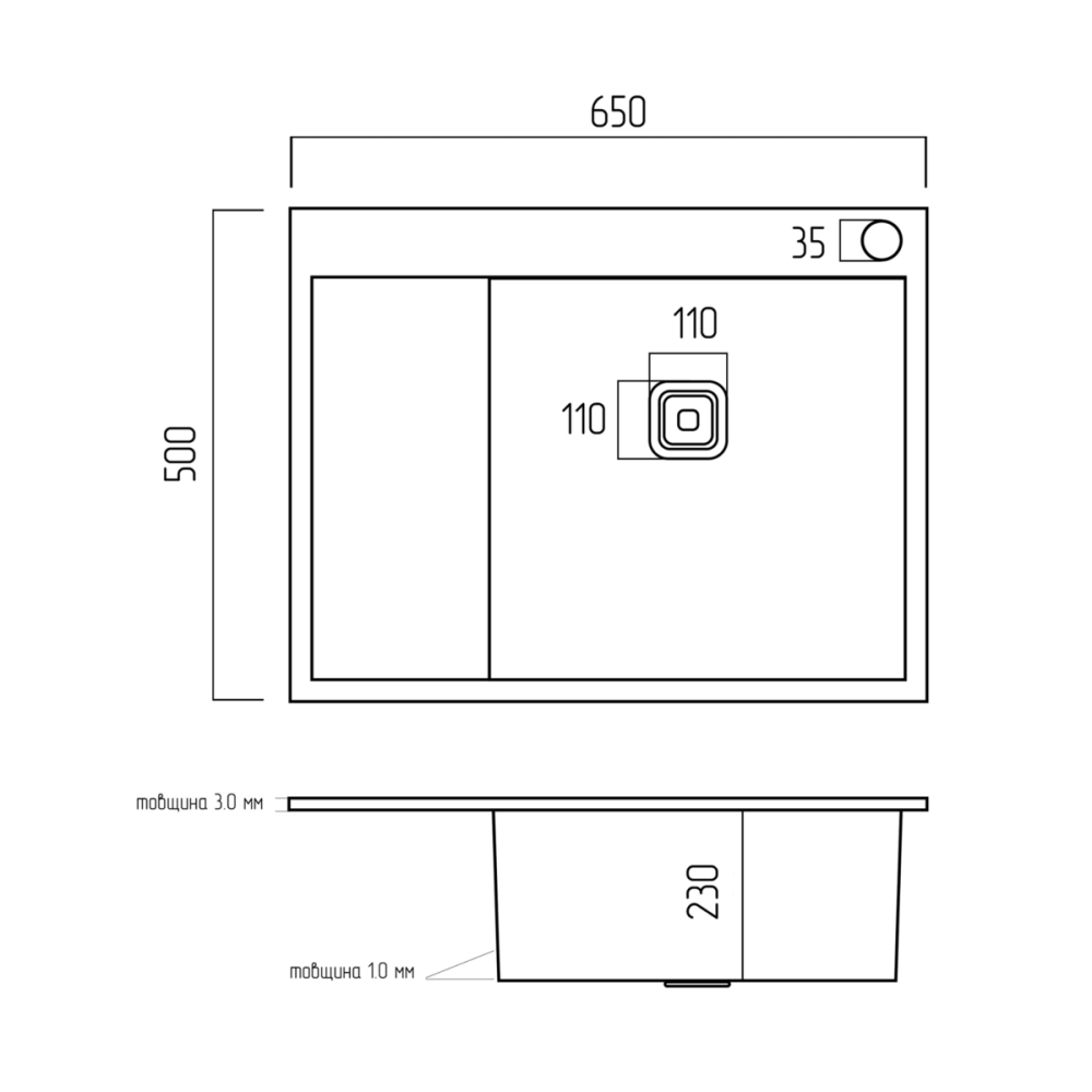 Розмір мийки складає 650 мм в ширину, 500 мм в глибину і 230 мм в висоту, забезпечуючи достатньо простору для миття посуду та приготування їжі. Мийка має квадратний сифон з розміром 3,0/1, що допомагає утримувати воду в мийці та уникати неприємних запахів.