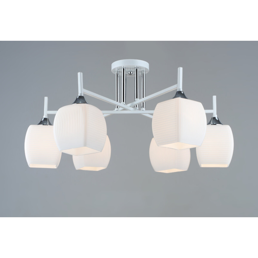 Каркас з металу в білому та хромовому кольорі надає люстрі Sirius B N5457/6 WT+CH легкості та стильної грації. Шість плафонів зі скла білого кольору, квадратної форми, додають чистоти та сучасності кожному приміщенню. Ця люстра ідеально вписується в різні стилі та призначена для використання в кухні, спальні, вітальні або інших приміщень де ви захочете створити затишну атмосферу та надійне освітлення.