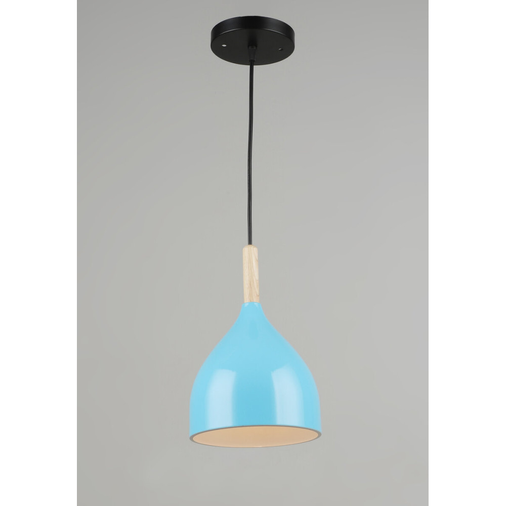 Каркас цієї вишуканої люстри виготовлений з металу блакитного кольору, що надає їй сучасний і стильний вигляд. Біля плафона розташований елемент дерева, що додає особливого шарму та природності дизайну.