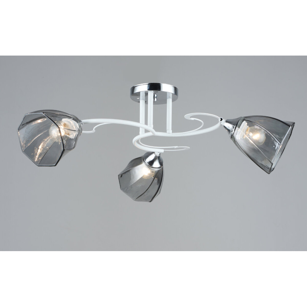 Люстра оснащена трьома плафонами зі скла в хромовому кольорі. Плафони мають конусну форму, що додає їм естетичного привабливості. На поверхні плафонів присутні лінії, які створюють цікавий графічний ефект і додають світлу точку у дизайні люстри.