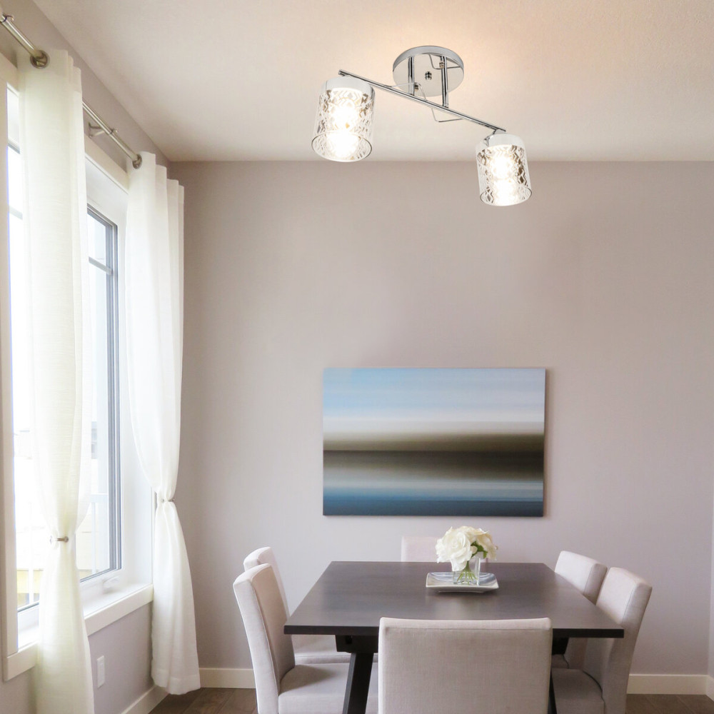 Два плафони виконані з прозорого скла з срібними елементами, які додають особливий шарм і блиск до освітлення. Плафони мають циліндричну форму і спрямовані вниз, що забезпечує пряме і концентроване освітлення. Прозоре скло дозволяє показати красу і розподіл світла, а срібні елементи додають нотку сучасності і елегантності.