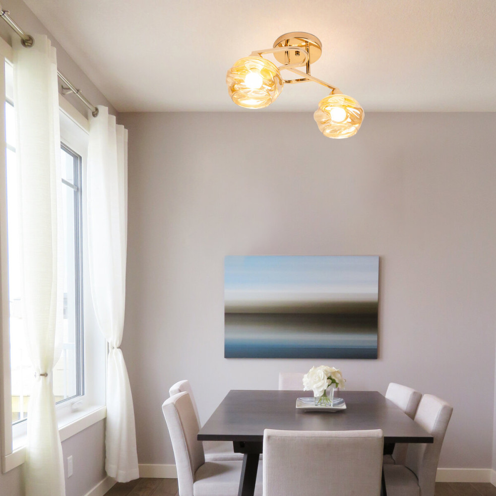 Плафони лампи мають колоподібну нерівну форму і виготовлені зі скла в золотистому кольорі. Ця нерівна форма додає особливої привабливості і оригінальності до плафонів. Золотисте скло надає приємного теплого відтінку і створює затишну атмосферу освітлення.