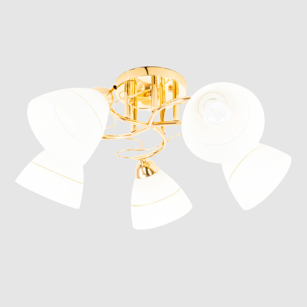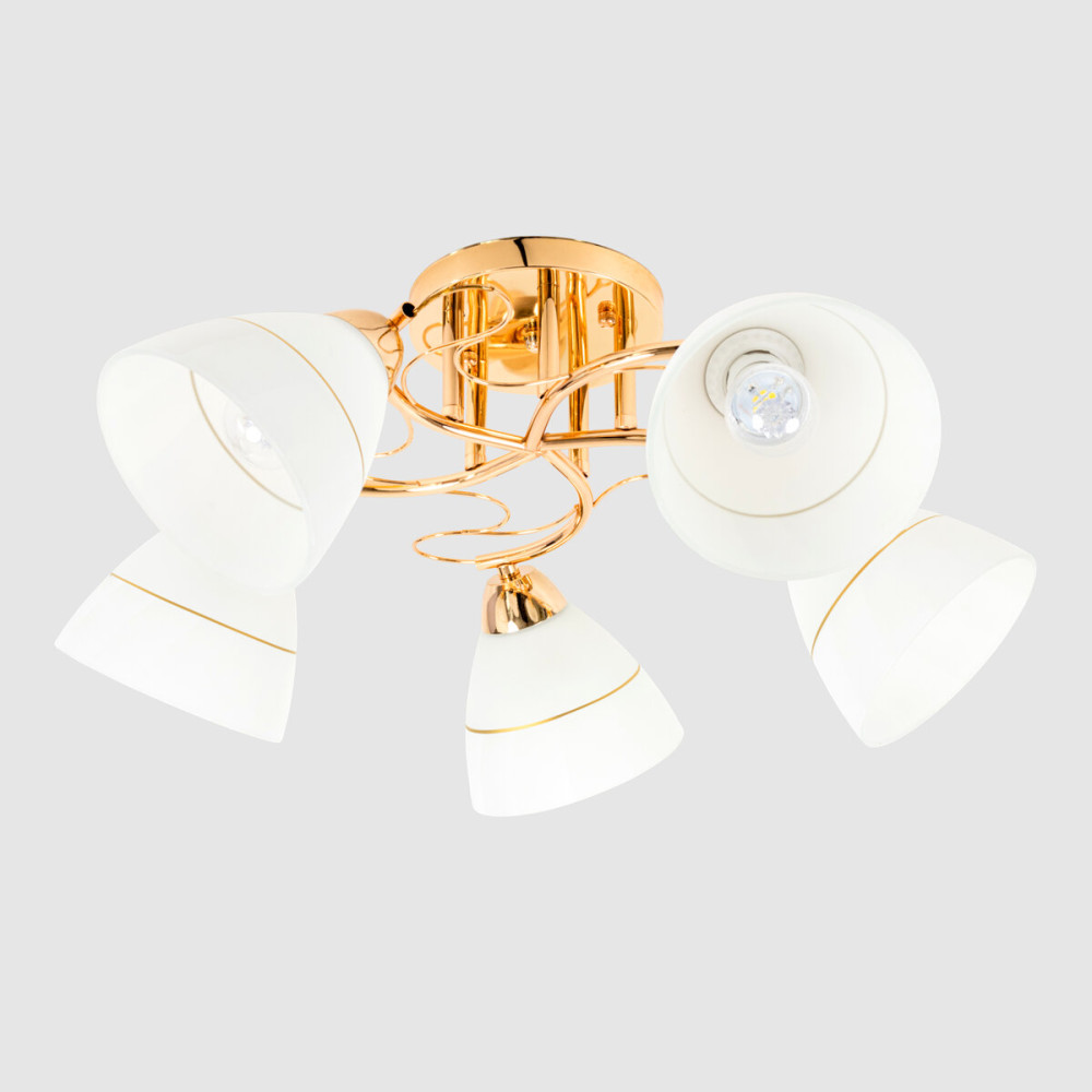 Люстра Sirius Л 8085/5 є розкішним освітлювальним приладом з п'ятьма плафонами. Каркас люстри виготовлений з металу в золотому кольорі, що надає йому елегантний і розкішний вигляд.