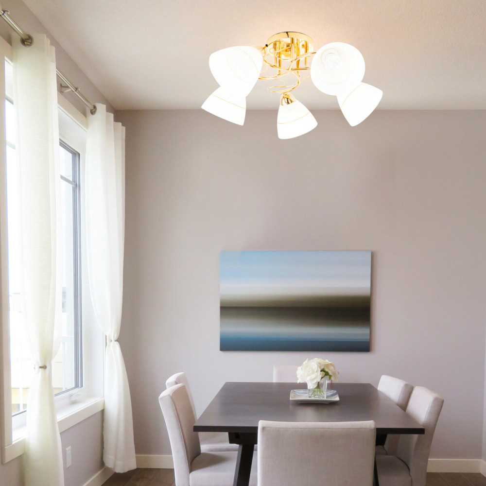 Плафони лампи мають конусну форму і виготовлені з білого скла з маленькою золотистою лінією. Ця деталь додає вишуканості і стилю до плафонів, створюючи неповторний ефект освітлення. Біле скло забезпечує м'яке і рівномірне розподілення світла.