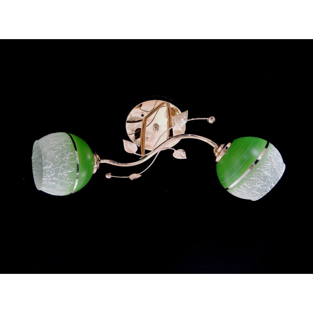 Люстра оснащена двома круглими плафонами зі скла прозоро-зеленого кольору. Ця комбінація кольорів створює освітлення, яке прекрасно розсіюється і надає приміщенню атмосферу свіжості та енергії.