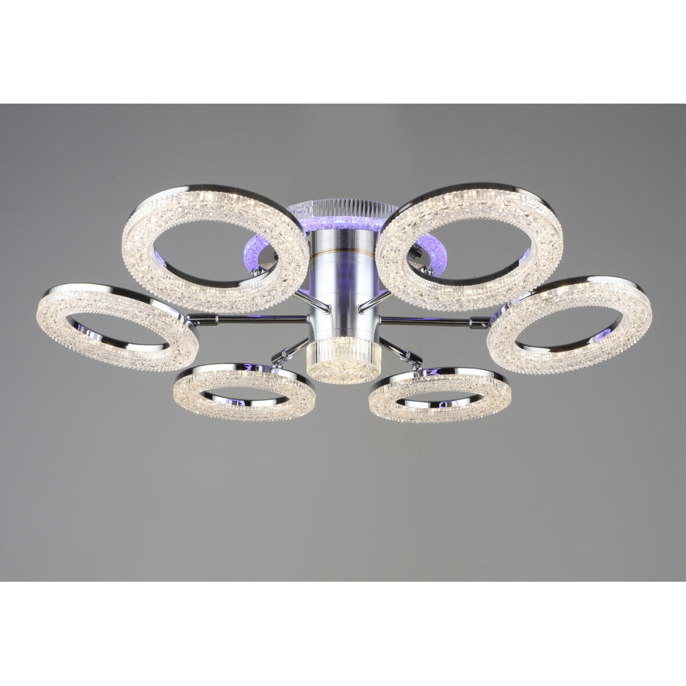 Благородний металевий каркас у хромовому кольорі, разом з шістьма акриловими плафонами круглої форми, виражає не лише сучасний дизайн, але та елегантність. Вбудована підсвітка корпусу та зручний пульт в комплекті додають функціональність та комфорт в користуванні.