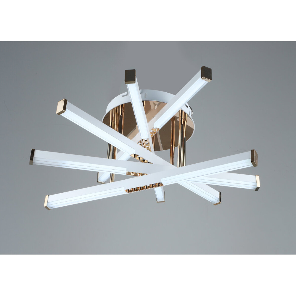 Її елегантний металевий каркас і п'ять плафонів з акрилу білого та золотого кольору відзначаються не лише стилізованим дизайном, але й дивовижною функціональністю. З вбудованими діодами та потужністю 65 Ватт, ця люстра стане не лише джерелом світла, а й витвором мистецтва в вашому інтер'єрі.