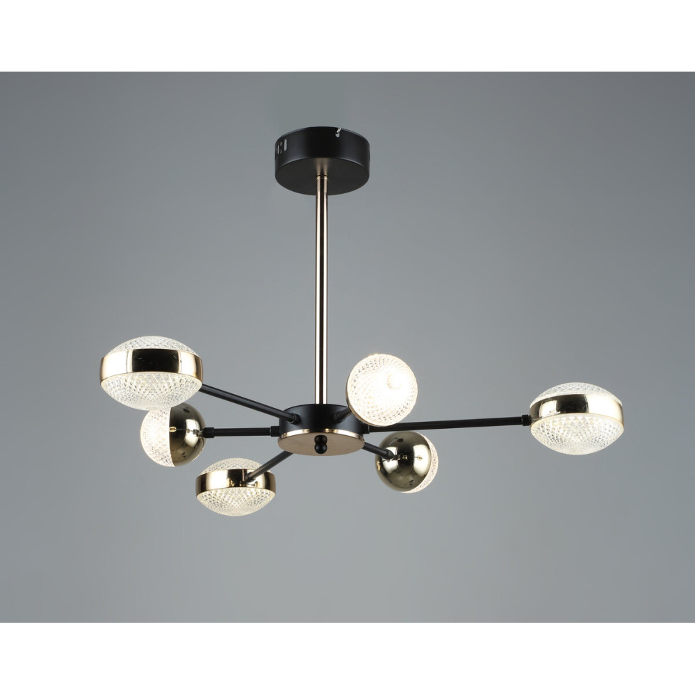 Металевий каркас в кольорі кави з позолотою додає розкоші та елегантності, вирізняючись унікальним дизайном. Шість круглих плафонів зі скла роблять освітлення непередбачувано чарівним. З потужністю 33 Ватт та регульованою колірною температурою від теплого до холодного світла, ця люстра дозволяє створити атмосферу, яка відповідає вашому настрою та потребам.