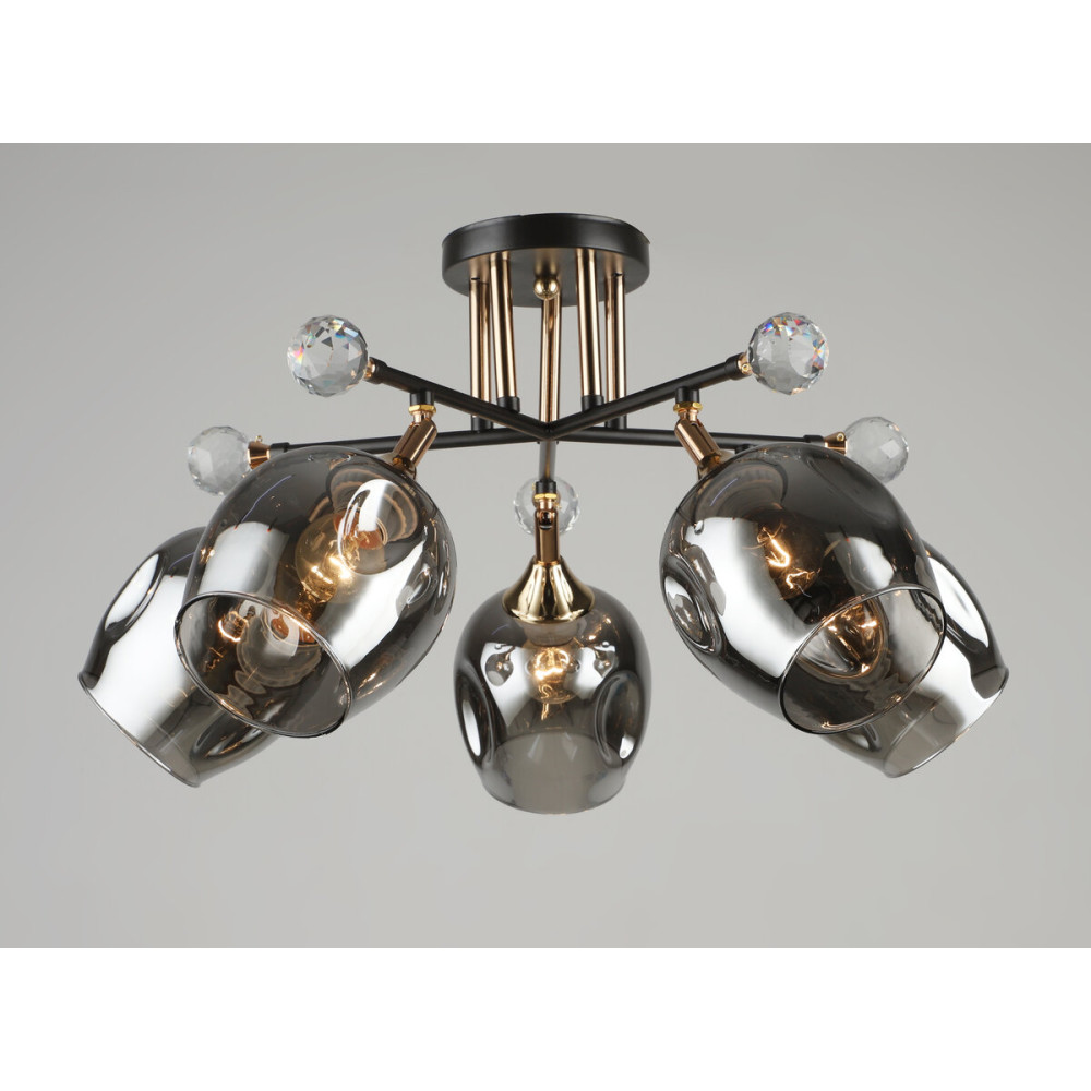 З діаметром 580 мм та висотою 280 мм, ця люстра стане незамінним джерелом світла для вашого простору. П'ять плафонів зі скла відтінку кави з позолотою, у формі напівсфер, подарують вам приємний розсіяний світловий відтінок.