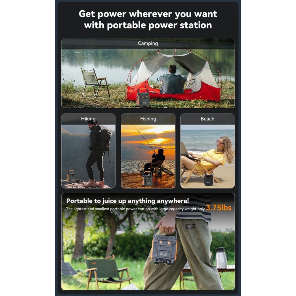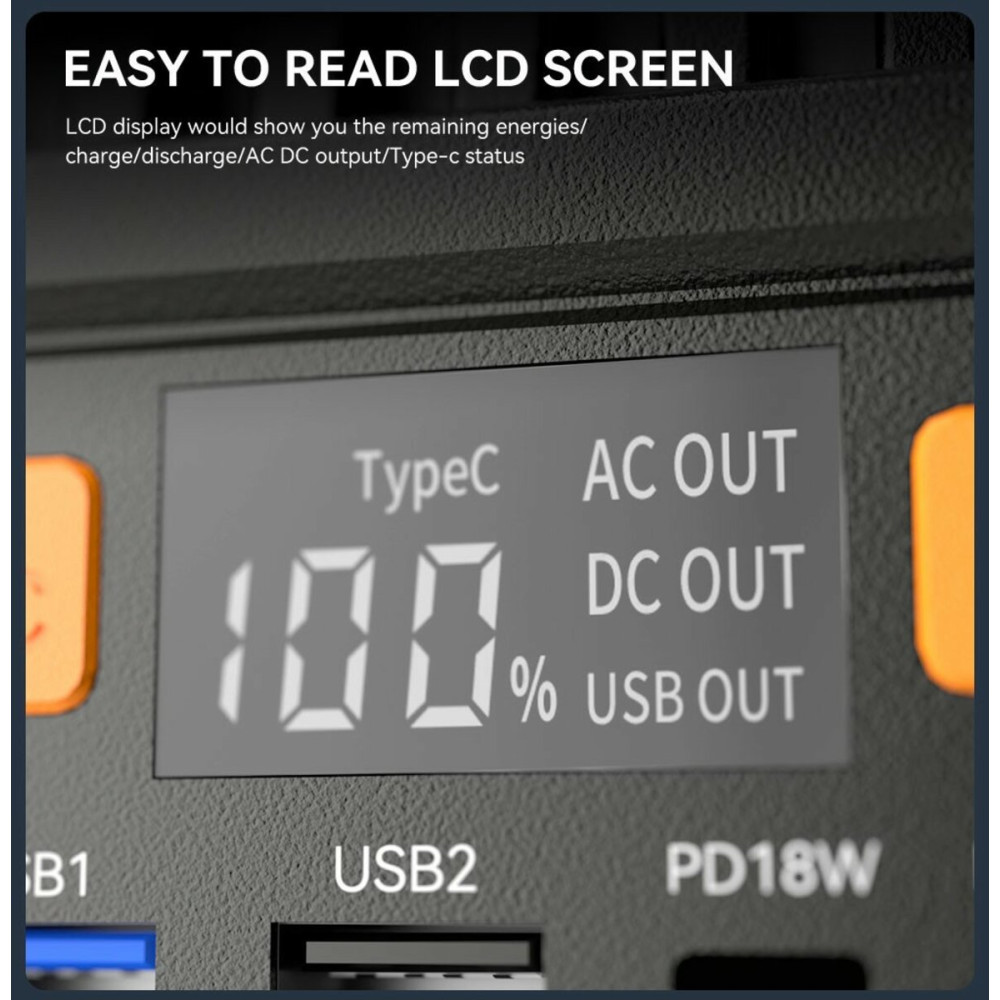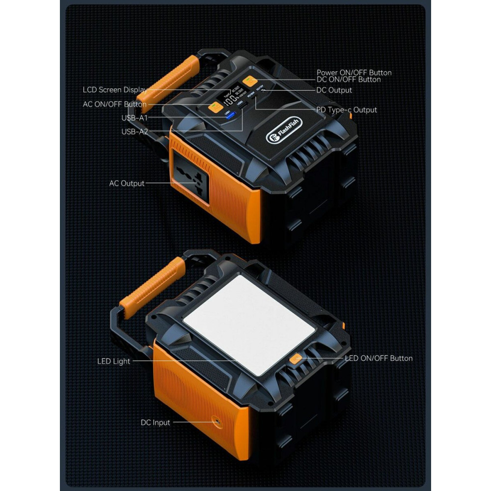 Це ідеальний, компактний, легкий та практичний акумуляторний генератор для використання вдома, на вулиці та в інших ситуаціях, коли потрібне термінове живлення. Має 1 розетку перемінного струму, 1 розетку постійного струму, 1 розетку PD, 2 розетки USB.