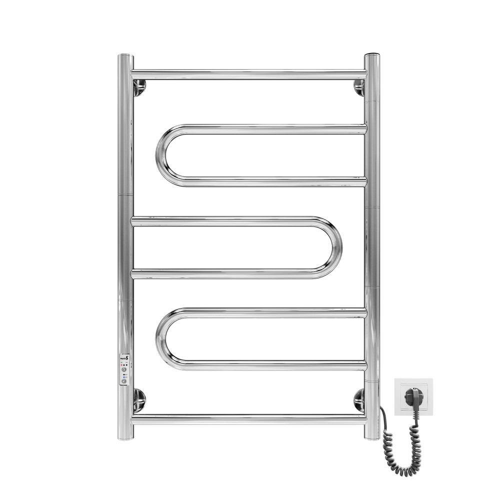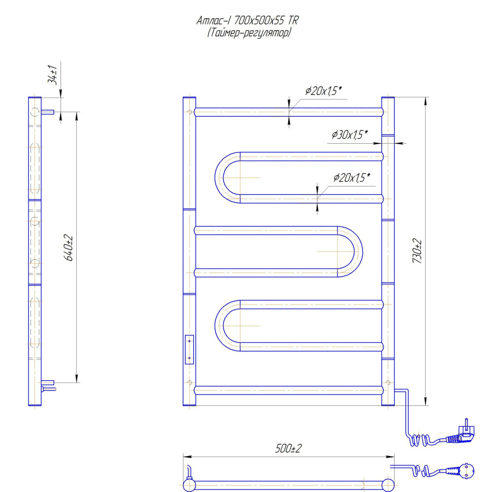 Электросушилка для полотенец бытовая Атлас 700х500/55 TR.Оборудована таймером-регулятором и коннектором для подключения в розетку с любой стороны. Совместима с комплектом скрытого подключения.Имеет 5 ребер и стояк из круглой трубы.Изготовлен из полированной нержавеющей стали без хромирования. Варианты покрытия: полированная.Температурные режимы таймер-регулятора: 40°С, 45°С, 50°С. Варианты времени: 3, 6 часов и постоянный нагрев. Мощность 105 Вт.Дополнительно для удобства использования можно оснастить навесными крючками.Гарантия – 5 лет.
