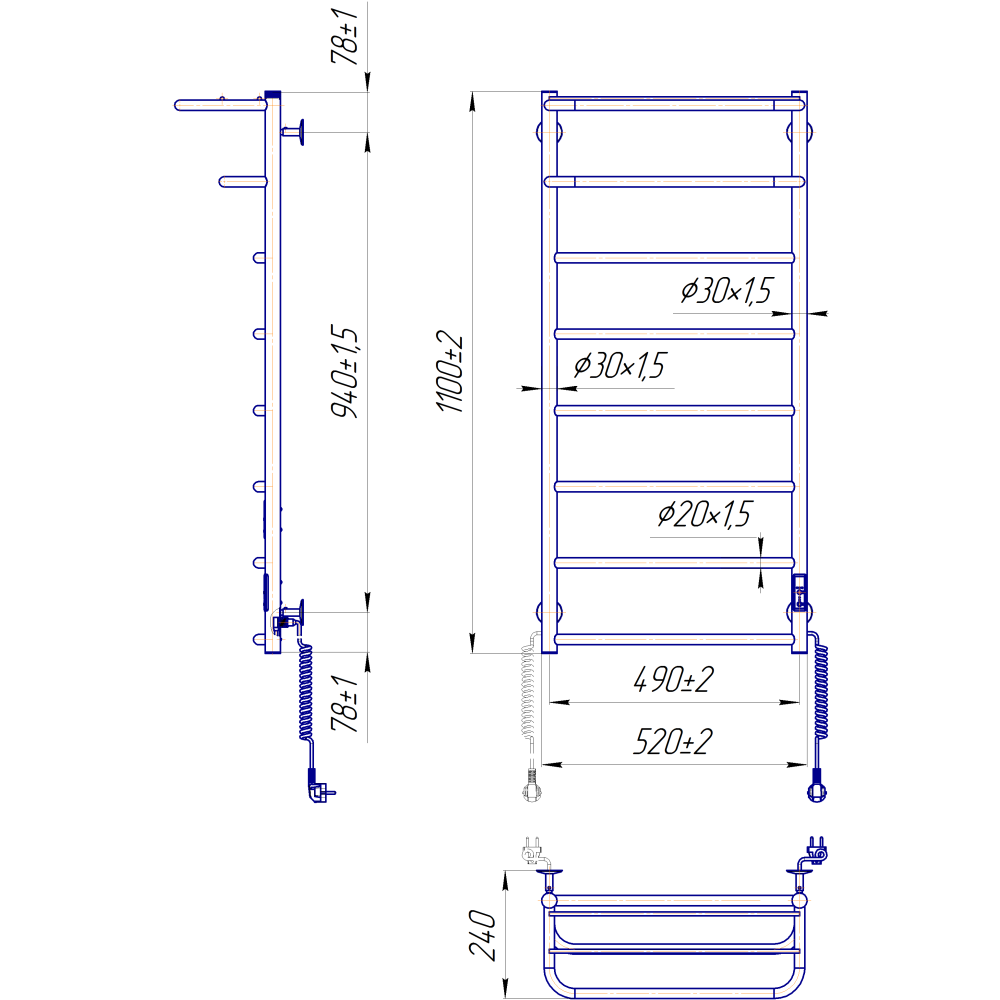 Электросушилка для полотенец бытовая Hotel-І 1090х530/240 TR К.Оборудована таймером-регулятором и коннектором для подключения в розетку с любой стороны. Совместима с комплектом скрытого подключения.Имеет 8 ребер и стояк из круглой трубы.Изготовлен из полированной нержавеющей стали без хромирования. Варианты покрытия: полированный или сатин, черный мат, белый глянец, золото, бронза.Температурные режимы таймер-регулятора: 40°С, 45°С, 50°С. Варианты времени: 3, 6 часов и постоянный нагрев. Мощность 125 Вт.Дополнительно для удобства использования можно оснастить навесными крючками.Гарантия – 5 лет.
