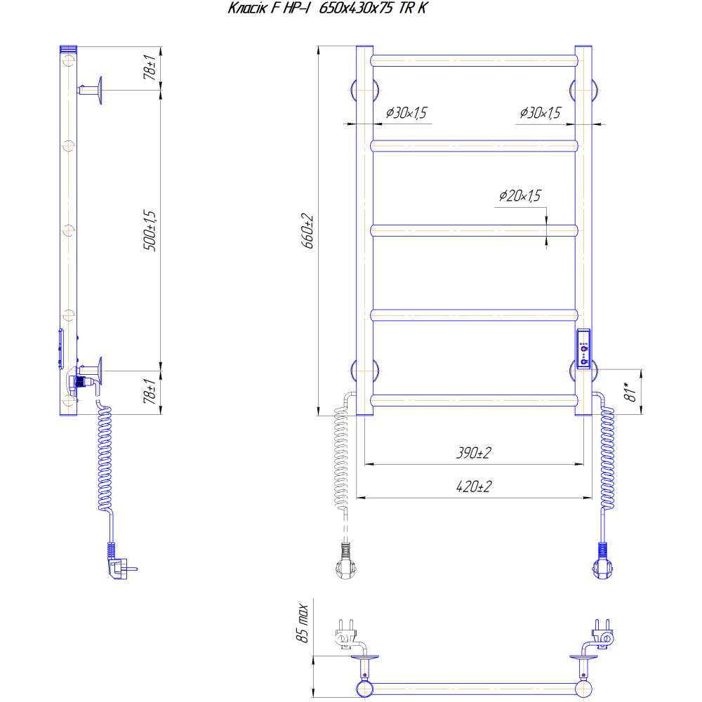 Электросушилка для полотенец бытовая Классик F НР-I 650х430/75 TR K.Оборудована таймером-регулятором и коннектором для подключения в розетку с любой стороны. Совместима с комплектом скрытого подключения.Имеет 5 ребер и стояк из круглой трубы.Изготовлен из полированной нержавеющей стали без хромирования. Варианты покрытия: полированный или сатин, черный мат, белый глянец, бронза, золото.Температурные режимы таймер-регулятора: 40°С, 45°С, 50°С. Варианты времени: 3, 6 часов и постоянный нагрев. Мощность 65 Вт.Дополнительно для удобства использования можно оснастить навесными крючками.Гарантия – 5 лет.