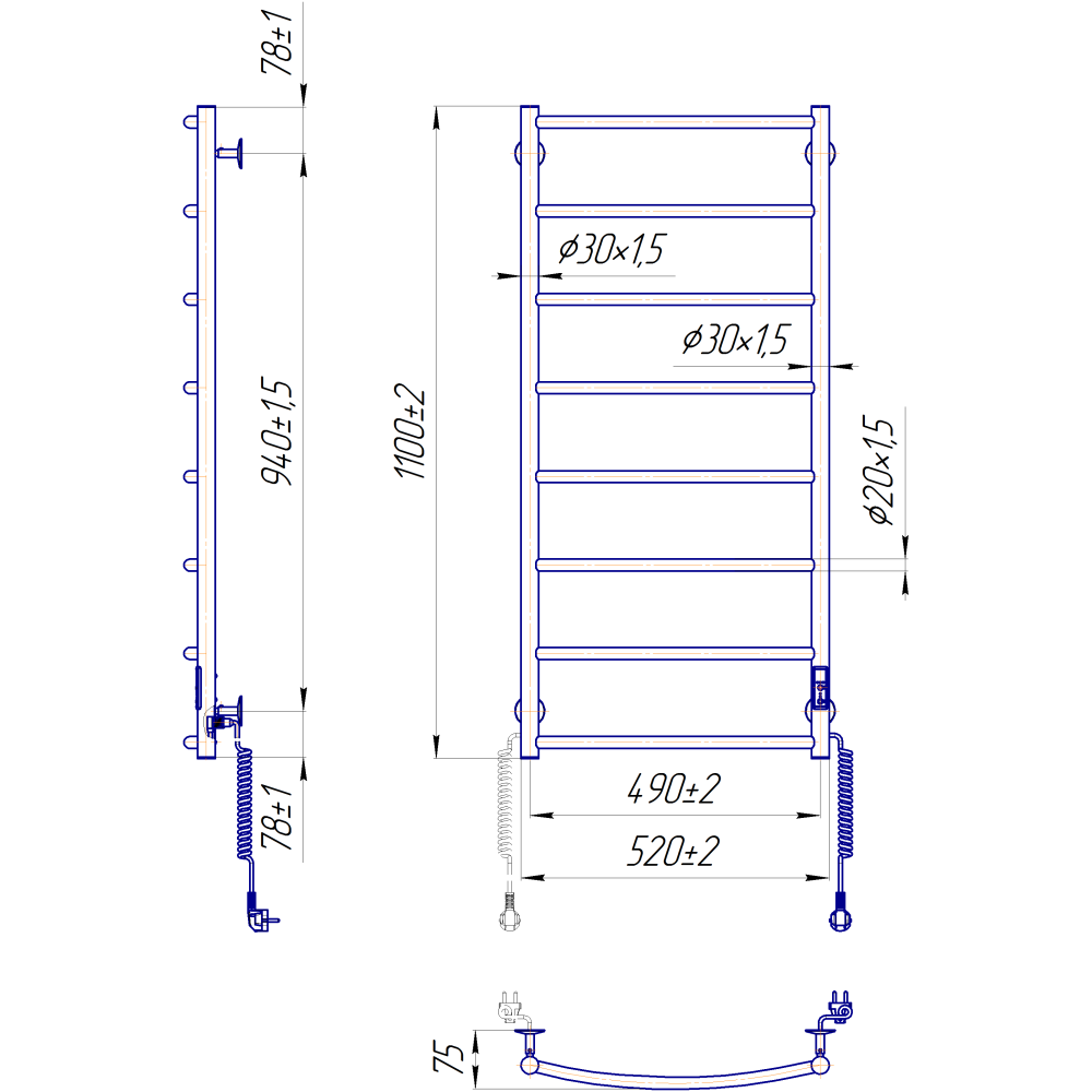 Электрополотенцесушитель бытовая Классик НР-І 1090х530/85 TR К.Оборудована таймером-регулятором и коннектором для подключения в розетку с любой стороны. Совместима с комплектом скрытого подключения.Имеет 8 ребер и стояк из круглой трубы.Изготовлен из полированной нержавеющей стали без хромирования. Варианты покрытия: полированный или сатин, черный мат, белый глянец, золото, бронза.Температурные режимы таймер-регулятора: 40°С, 45°С, 50°С. Варианты времени: 3, 6 часов и постоянный нагрев. Мощность 115 Вт.Дополнительно для удобства использования можно оснастить навесными крючками.Гарантия – 5 лет.