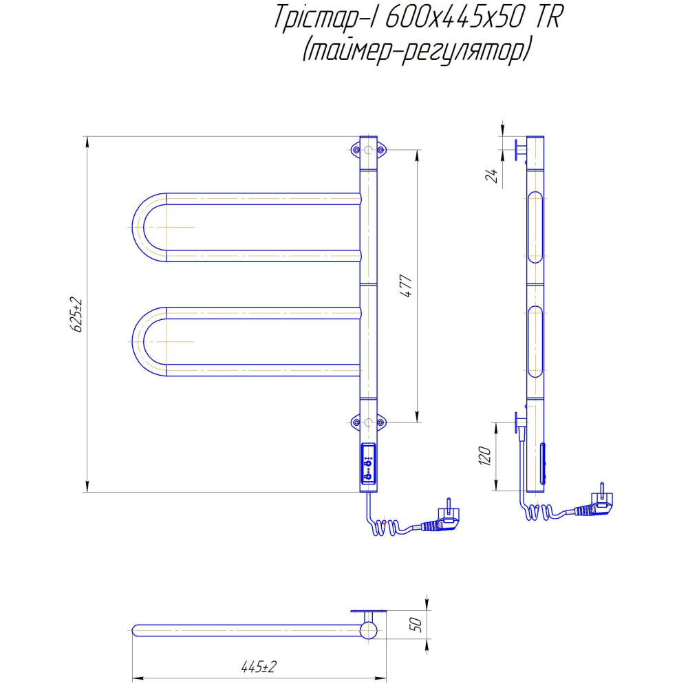 Электросушилка для полотенец бытовая Тристар-I 600х445/55 TR.Оборудована таймер-регулятором.Имеет 2 ребра и стояк из круглой трубы.Изготовлен из полированной нержавеющей стали без хромирования. Варианты покрытия: полированный, черный мат.Температурные режимы таймер-регулятора: 40°С, 45°С, 50°С. Варианты времени: 3, 6 часов и постоянный нагрев. Мощность 50 Вт.Дополнительно для удобства использования можно оснастить навесными крючками.Гарантия – 5 лет.