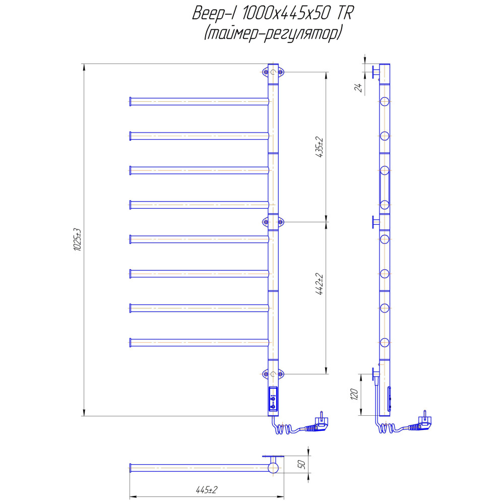 Электросушилка для полотенец бытовая Веер-I 1000х445/55 TR.Оборудована таймер-регулятором. Возможна вариация с комплектом скрытого подключения.Имеет 8 ребер, которые возвращаются на 180* и стояк из круглой трубы.Изготовлен из полированной нержавеющей стали без хромирования. Варианты покрытия: полированная.Температурные режимы таймер-регулятора: 40°С, 45°С, 50°С. Варианты времени: 3, 6 часов и постоянный нагрев. Мощность 95 Вт.Дополнительно для удобства использования можно оснастить навесными крючками.Гарантия – 5 лет.