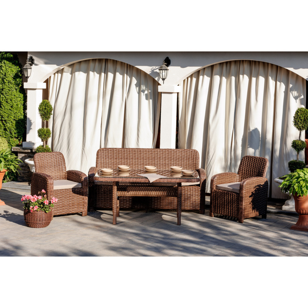 Стильний комплект садових меблів з ротангу АМЕЛІЯ складається із дивану, 2 крісел та столику. Диван та крісла мають зручні пологі підлокітники, що добре підтримують руку. Стіл покритий прозорим склом на фіксаторах. Набір подушок, що входить до комплекту гарантовано забезпечить максимум релаксу і дозволить відпочити по-справжньому Вам і Вашим гостям. Комплект виготовлено із штучного ротангу, який стійкий до УФ променів, різких перепадів температур та зміни вологості, не деформується при використанні, легкий у догляді. Основа меблів - металевий каркас.