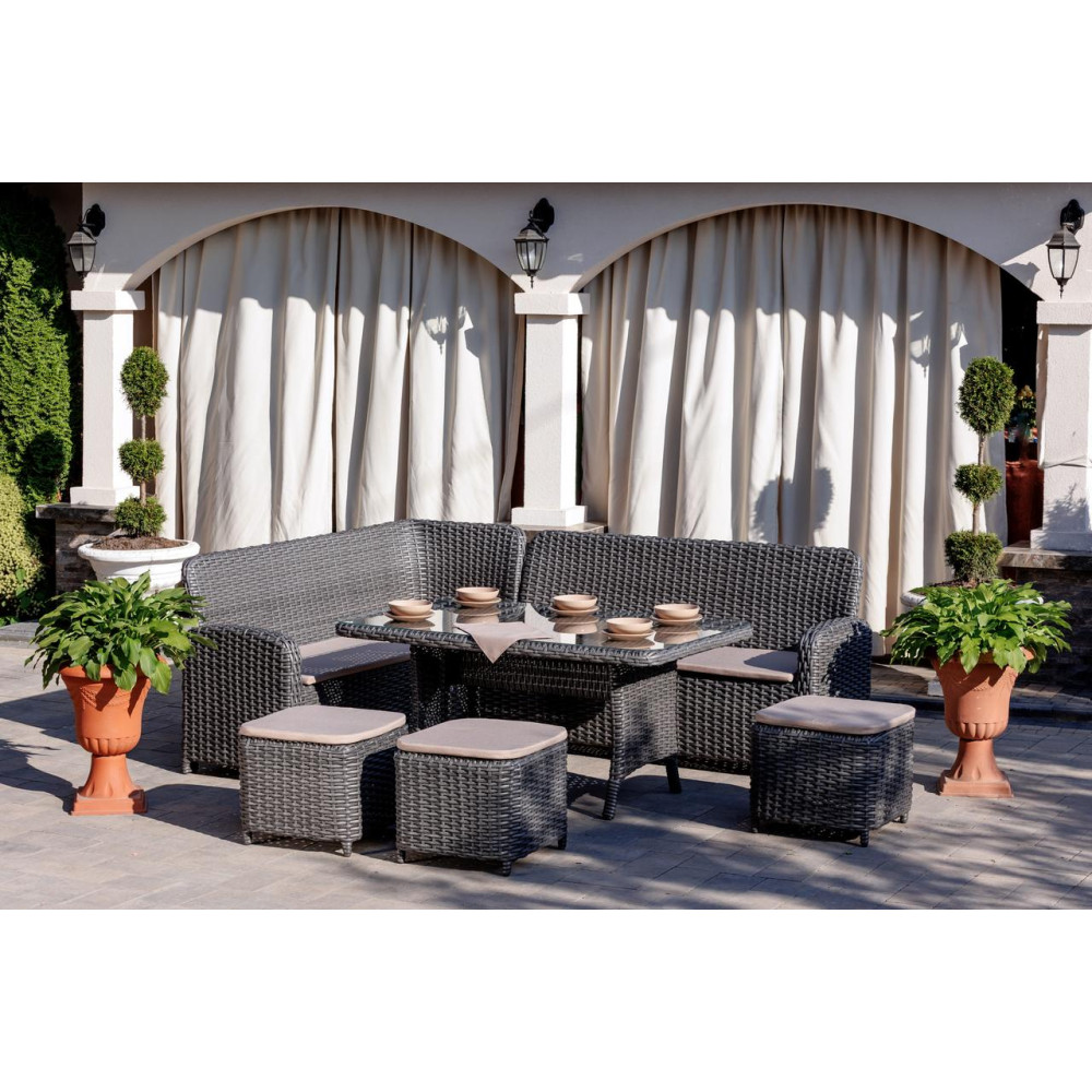 Комплектація: стіл, скло на стіл, прямий диван, кутовий диван, 3 пуфа, набір подушок.