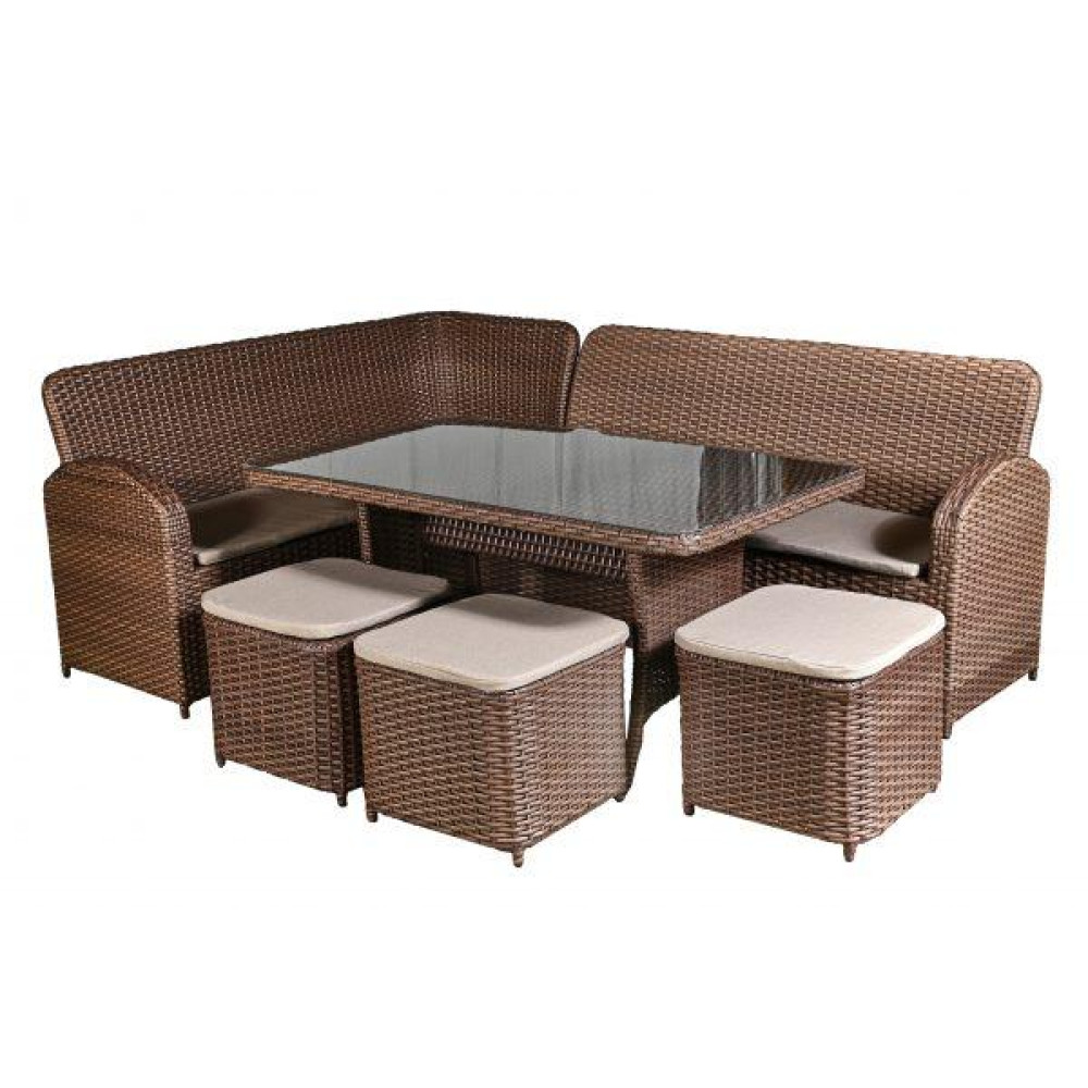 Стильний комплект садових меблів з ротангу Глорія складається із двох диванів, 3 пуфів та столику. Дивани мають зручні пологі підлокітники, що добре підтримують руку. Стіл покритий прозорим склом на фіксаторах. Набір подушок, що входить до комплекту гарантовано забезпечить максимум релаксу і дозволить відпочити по-справжньому Вам и Вашим гостям. Комплект виготовлено із штучного ротангу, який стійкий до УФ променів, різких перепадів температур та зміни вологості, не деформується при використанні, легкий у догляді. Основа меблів - металевий каркас.