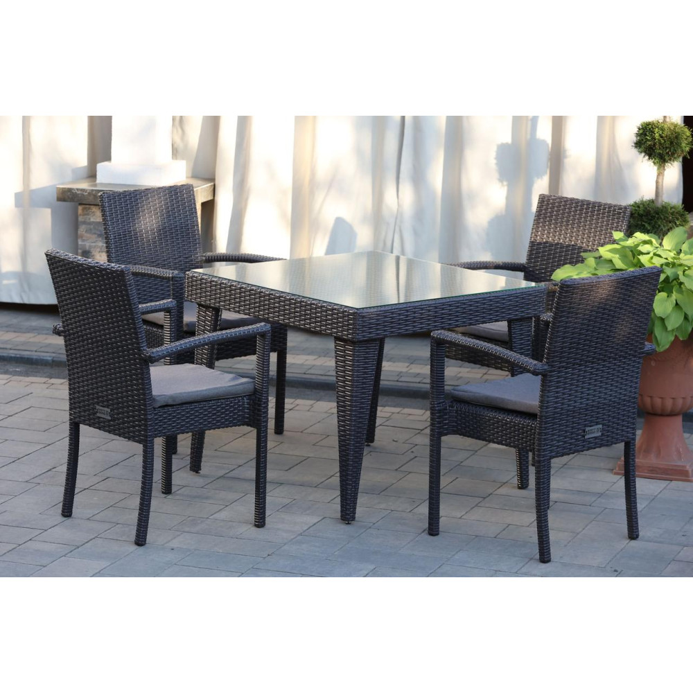 Елегантний садовий комплект меблів Класік Мідл чудово підійде для невеликої компанії. У комплект входить 4 зручні крісла з підлокітниками та стіл. Стіл зверху покритий склом на фіксаторах. Штучний ротанг, з якого виготовлено комплект, стійкий до УФ променів, різких перепадів температур та зміни вологості, не деформується при використанні. Основа меблів - металевий каркас. Для ще більшого комфорту в комплект додаються подушки.