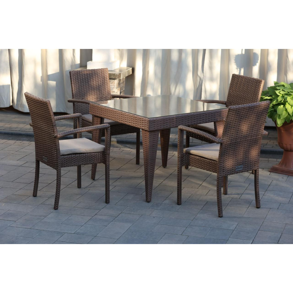 Елегантний садовий комплект меблів Класік Мідл чудово підійде для невеликої компанії. У комплект входить 4 зручні крісла з підлокітниками та стіл. Стіл зверху покритий склом на фіксаторах. Штучний ротанг, з якого виготовлено комплект, стійкий до УФ променів, різких перепадів температур та зміни вологості, не деформується при використанні. Основа меблів - металевий каркас. Для ще більшого комфорту в комплект додаються подушки.