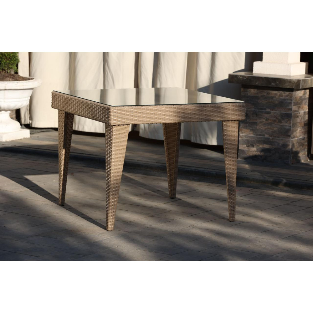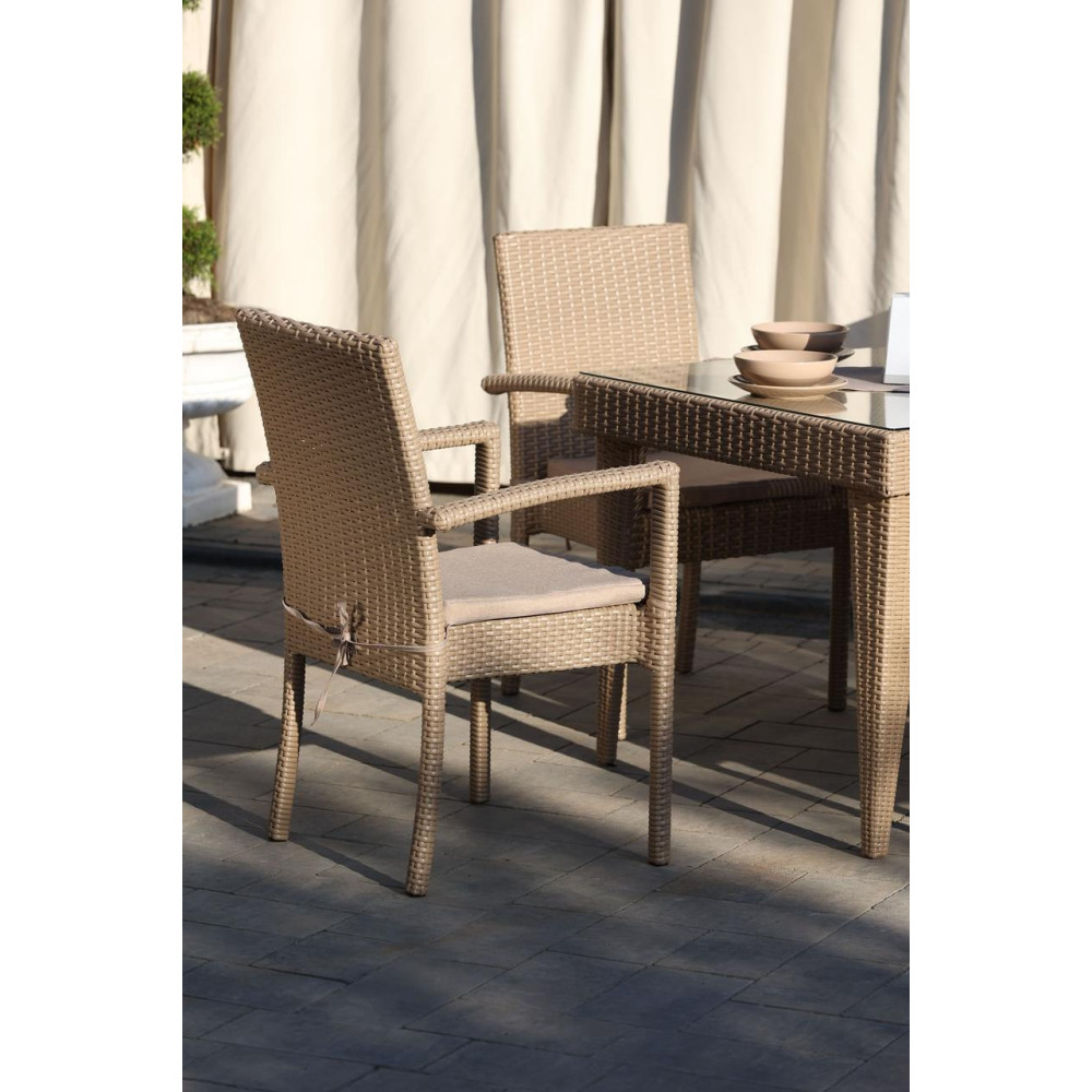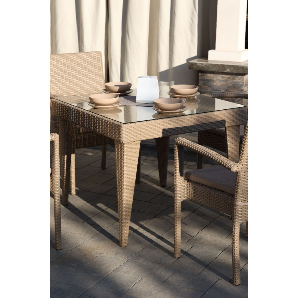 Елегантний садовий комплект меблів Класік Міні чудово підійде для невеликої компанії. У комплект входить 4 зручні крісла з підлокітниками та стіл. Стіл зверху покритий склом на фіксаторах. Штучний ротанг, з якого виготовлено комплект, стійкий до УФ променів, різких перепадів температур та зміни вологості, не деформується при використанні. Основа меблів - металевий каркас. Для ще більго комфорту в комплект додаються подушки.