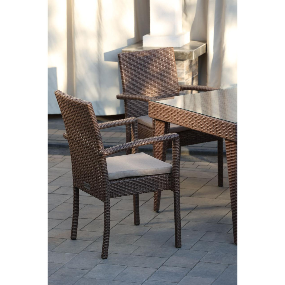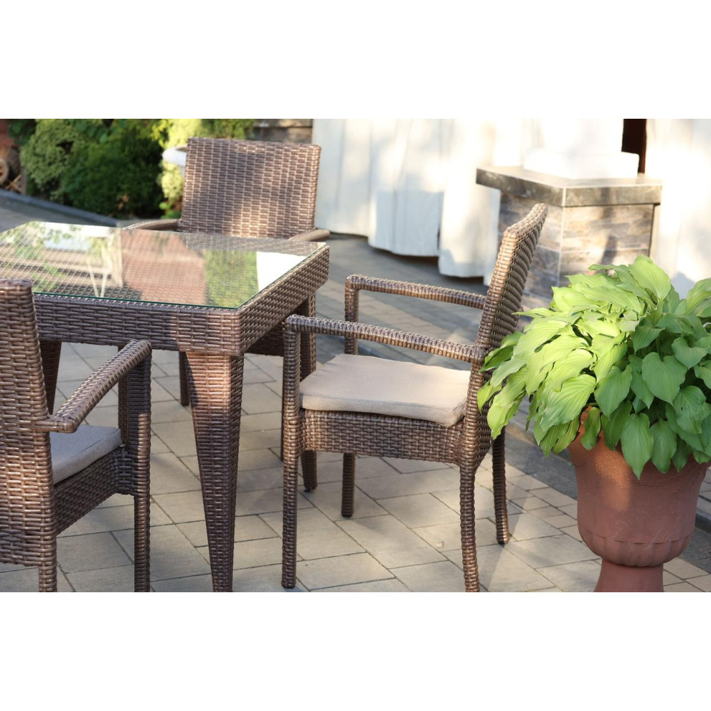 Елегантний садовий комплект меблів Класік Міні чудово підійде для невеликої компанії. У комплект входить 4 зручні крісла з підлокітниками та стіл. Стіл зверху покритий склом на фіксаторах. Штучний ротанг, з якого виготовлено комплект, стійкий до УФ променів, різких перепадів температур та зміни вологості, не деформується при використанні. Основа меблів - металевий каркас. Для ще більго комфорту в комплект додаються подушки.