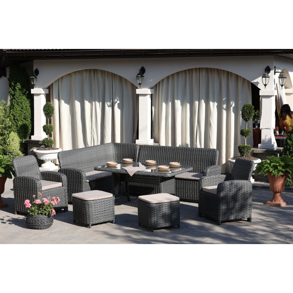 Комплектація: стіл, скло на стіл. прямий диван, кутовий диван, 2 крісла, 2 пуфа, набір подушок.