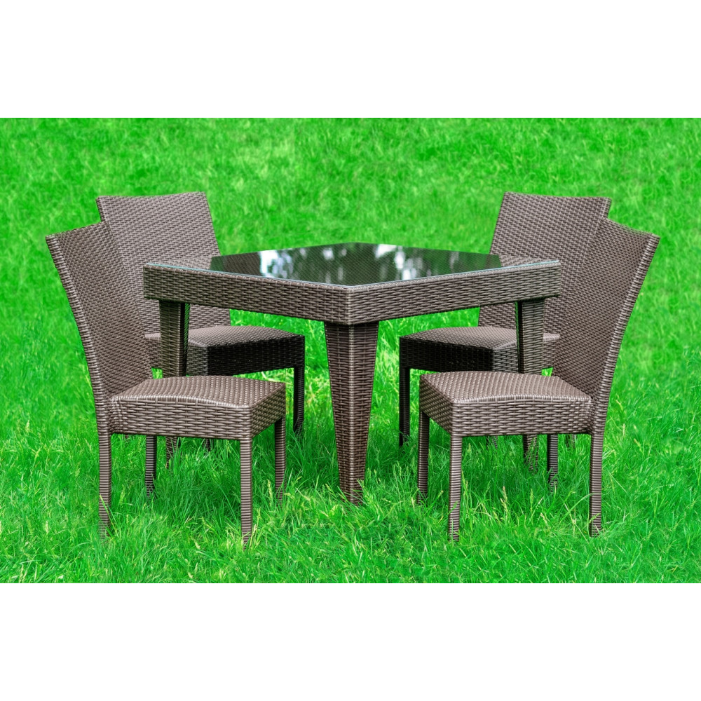 Класичний садовий комплект ротангових меблів МОККО MINI стане прекрасним доповненням ресторану, літньої тераси, чи невеликого літнього дворику. У набір входить квадратний стіл з прозорим склом та 4 крісла без підлокітників. Комплект виготовлено з штучного ротангу, стійкого до УФ променів, різких перепадів температур та зміни вологості, не деформується при використані, легкий у догляді.