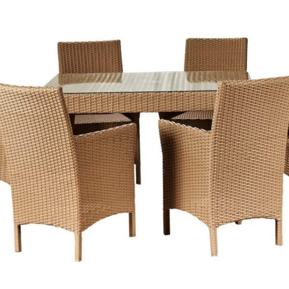 Елегантний садовий комплект із ротангу МОНАКО МІНІ складається із 4 вишуканих крісел із підлокітниками та квадратного столу із прозорим склом на фіксаторах. Крісла мають зручні підлокітники, що комфортно підтримують руку. Комплект виготовлено з штучного ротангу, стійкого до УФ променів, різких перепадів температур та зміни вологості, не деформується при використані, легкий у догляді. Основа меблів - металевий каркас. Для підвищення комфорту в наборі присутні подушки для ротангових крісел.