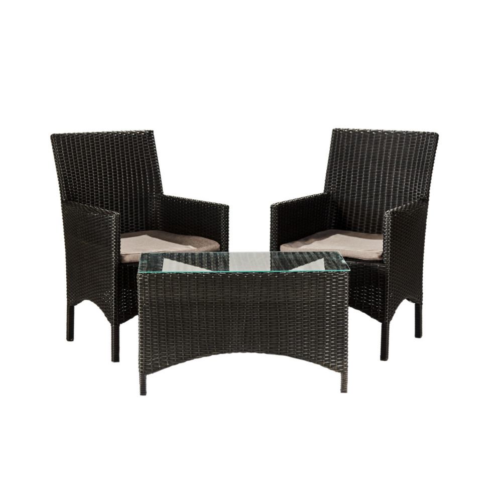 Садовий комплект із ротангу Монако Твін складається із 2 крісел із підлокітниками та прямокутного столу із прозорим склом на фіксаторах. Крісла мають зручні підлокітники, що комфортно підтримують руку. Комплект виготовлено зі штучного ротангу, стійкого до УФ променів, різких перепадів температур та зміни вологості, не деформується при використанні, легкий у догляді. Основа меблів - металевий каркас. Для підвищення комфорту в наборі є подушки для крісел.