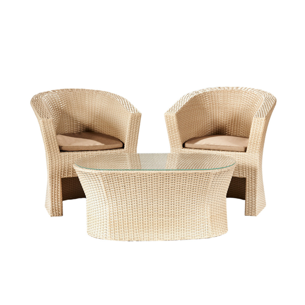 Садовий комплект Родзинка Твін складається з 2 крісел та столу із прозорим склом на фіксаторах.Крісла мають зручні підлокітники, що комфортно підтримують руку. Комплект виготовлено зі штучного ротангу, який стійкий до УФ променів, різких перепадів температур та зміни вологості, не деформується при використанні, легкий у догляді. Основа меблів - металевий каркас. Для підвищення комфорту в наборі є подушки для крісел.