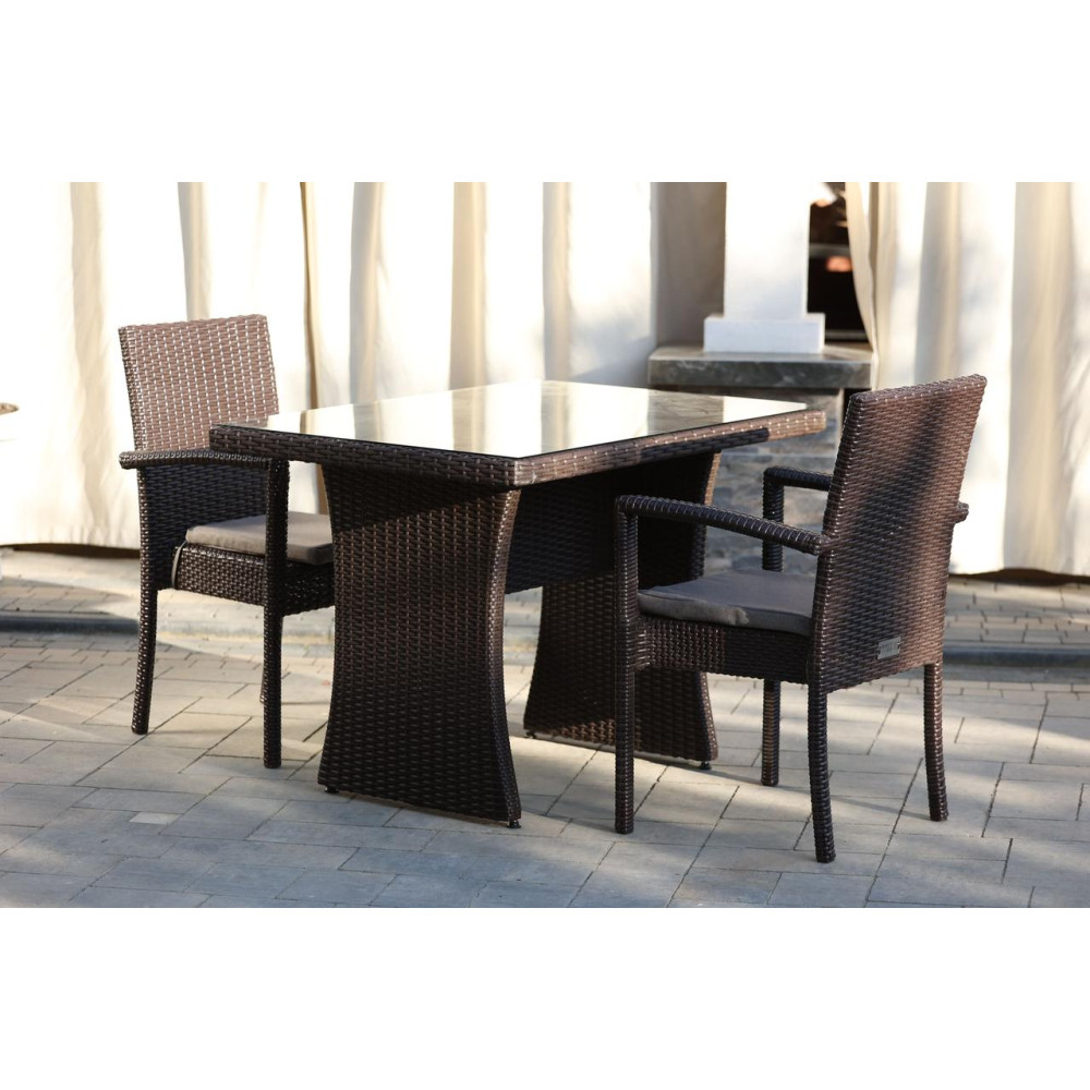Елегантний садовий комплект меблів Рондо Класік Дуо виготовлено зі штучного ротангу. У комплект входить 2 зручні крісла з підлокітниками та стіл. Стіл зверху покритий склом на фіксаторах. Штучний ротанг, з якого виготовлено комплект, стійкий до УФ променів, різких перепадів температур та зміни вологості, не деформується при використанні. Основа меблів - металевий каркас. Для підвищення комфорту до набору додаються подушки.