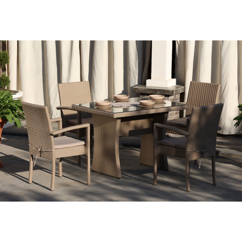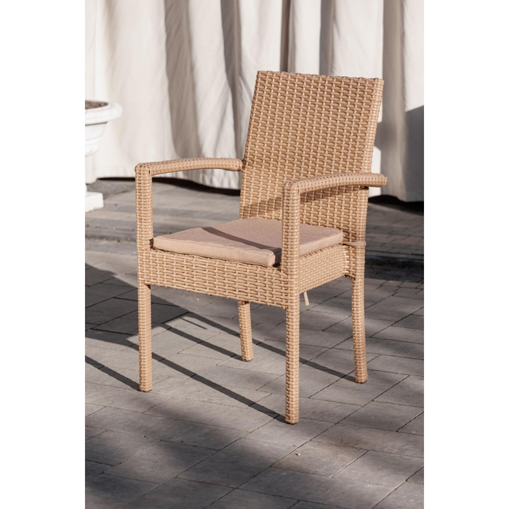 Елегантний садовий комплект меблів Рондо Класік Квадро виготовлено зі штучного ротангу. У комплект входить 4 зручні крісла з підлокітниками та стіл. Стіл зверху покритий склом на фіксаторах. Штучний ротанг, з якого виготовлено комплект, стійкий до УФ променів, різких перепадів температур та зміни вологості, не деформується при використанні. Основа меблів - металевий каркас. Для підвищення комфорту до набору додаються подушки.