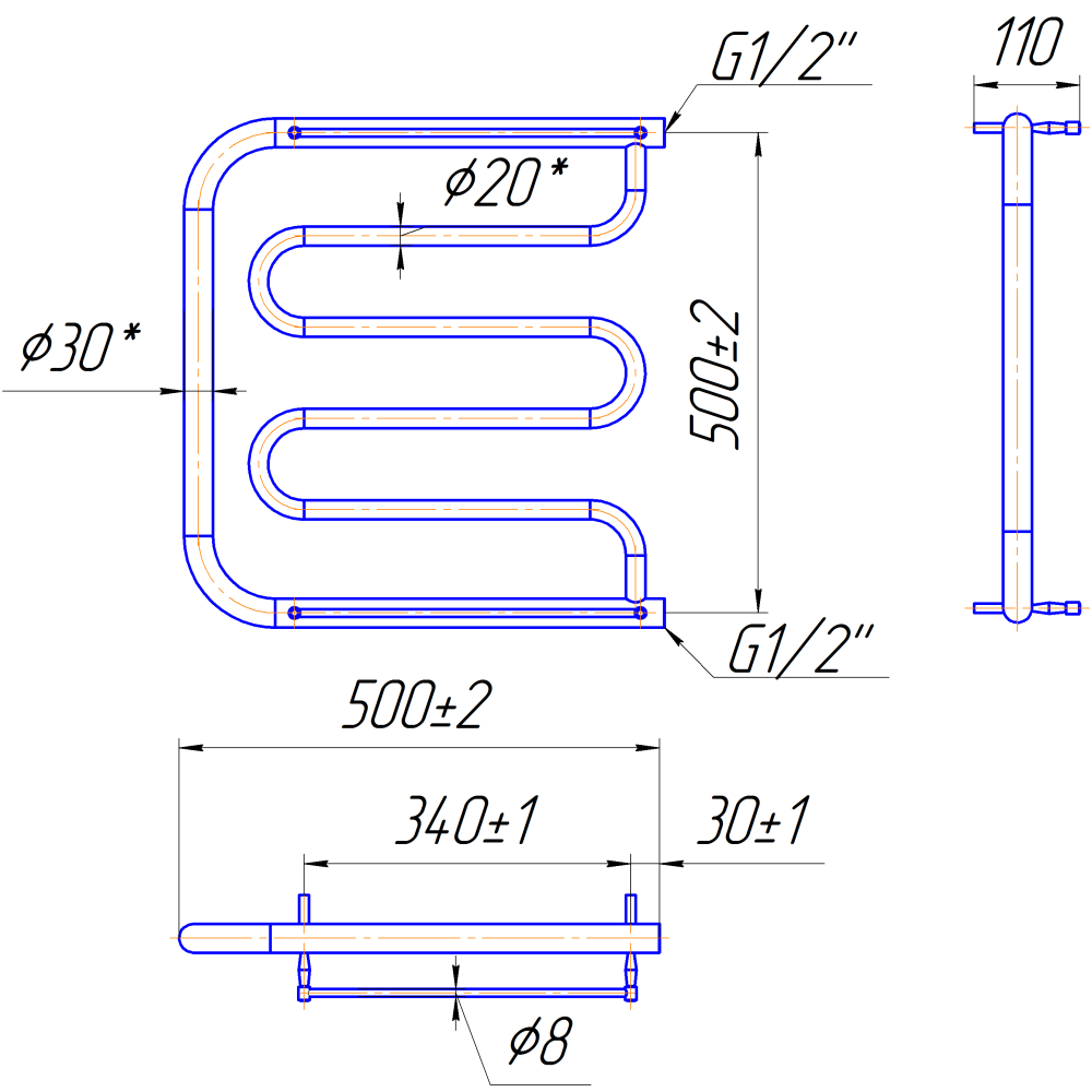 Рушникосушарка "Маріо" Фокстрот 530х500/500. Розміри: висота - 530 мм, ширина - 500 мм, глибина 110 мм, міжцентрова відстань для підключення - 500 мм, діаметр підключення G1/2''. Варіанти підключення: бічне. Кількість ребер - 6, стояки з круглої труби.Виготовлена з полірованої нержавіючої сталі без хромування. Варіанти покриття: полірована або сатин, чорний мат, білий глянець, золото, бронза. Сумісні аксесуари: навісні гачки для збільшення функціональності.Рекомендовано підключати рушникосушарку за допомогою кранів Маріо.Гарантія - 50 років в закритій системі опалення, 5 років у централізованій.