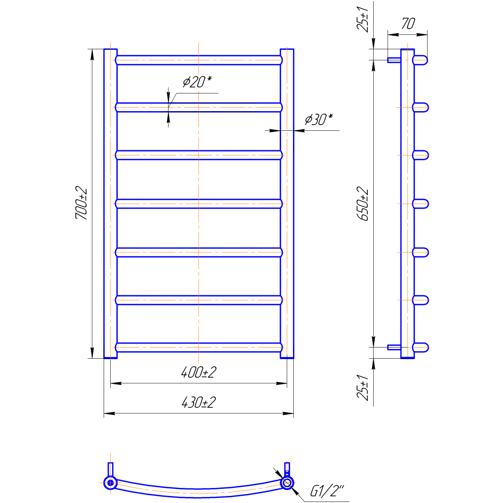 Рушникосушарка "Маріо" Класік 700х430/400. Розміри: висота - 700 мм, ширина - 430 мм, глибина 95 мм, міжцентрова відстань для підключення - 400 мм, діаметр підключення G1/2''. Варіанти підключення: нижнє, діагональне та бічне. Кількість ребер - 7, стояки з круглої труби.Виготовлена з полірованої нержавіючої сталі без хромування. Варіанти покриття: полірована або сатин, чорний мат, білий глянець, золото, бронза. Для всесезонної роботи водяну модель можна переобладнати на комбіновану, встановивши ТЕН, рекомендована потужність 120 Вт.Сумісні аксесуари: поворотні полиці та навісні гачки для збільшення функціональності.Рекомендовано підключати рушникосушарку за допомогою кранів Маріо.Гарантія - 50 років в закритій системі опалення, 5 років у централізованій.