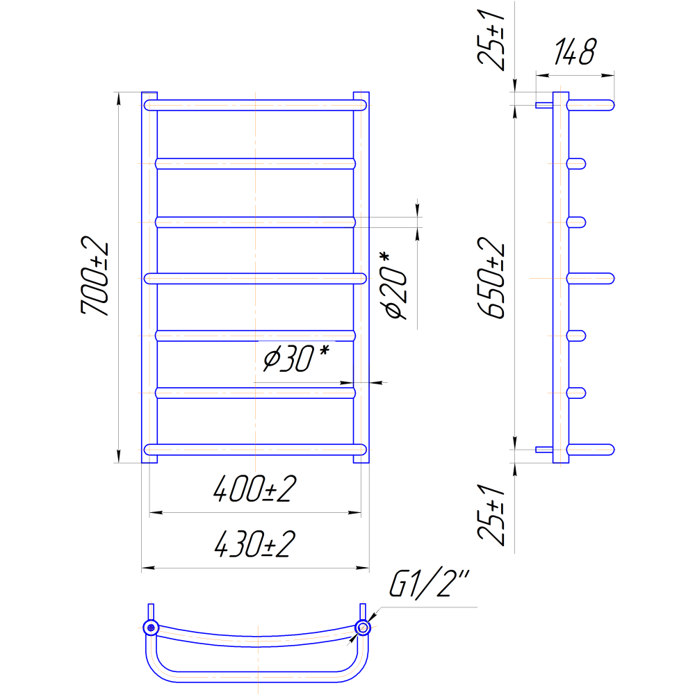 Рушникосушарка "Маріо" Люкс 700х430/400. Розміри: висота - 700 мм, ширина - 430 мм, глибина 170 мм, міжцентрова відстань для підключення - 400 мм, діаметр підключення G1/2''. Варіанти підключення: нижнє, діагональне та бічне. Кількість ребер - 7, стояки з круглої труби.Виготовлена з полірованої нержавіючої сталі без хромування. Варіанти покриття: полірована або сатин, чорний мат, білий глянець, золото, бронза. Для всесезонної роботи водяну модель можна переобладнати на комбіновану, встановивши ТЕН, рекомендована потужність 120 Вт.Сумісні аксесуари: поворотні полиці та навісні гачки для збільшення функціональності.Рекомендовано підключати рушникосушарку за допомогою кранів Маріо.Гарантія - 50 років в закритій системі опалення, 5 років у централізованій.