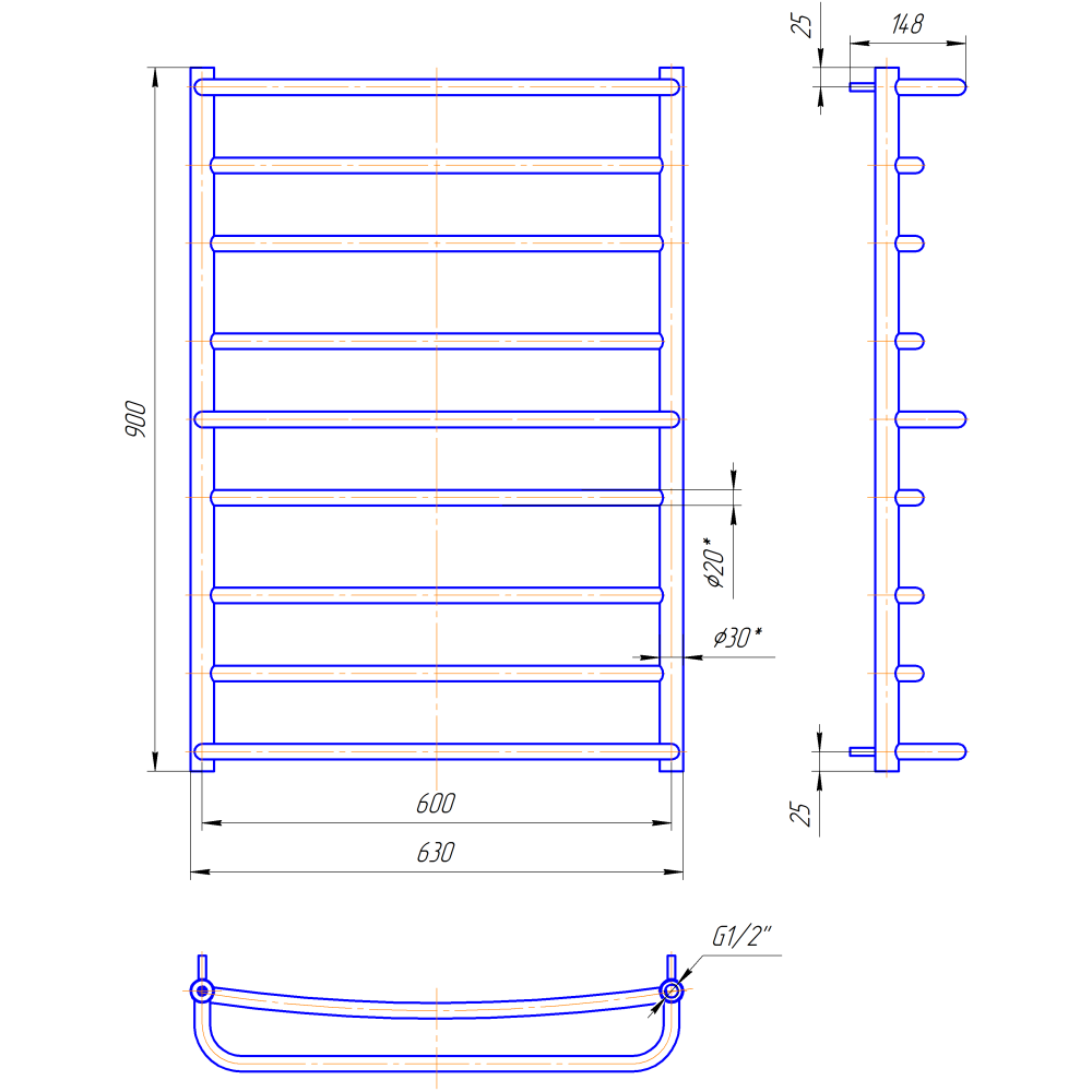 Рушникосушарка "Маріо" Люкс 900х630/600. Розміри: висота - 900 мм, ширина - 630 мм, глибина 170 мм, міжцентрова відстань для підключення - 600 мм, діаметр підключення G1/2''. Варіанти підключення: нижнє, діагональне та бічне. Кількість ребер - 9, стояки з круглої труби.Виготовлена з полірованої нержавіючої сталі без хромування. Варіанти покриття: полірована або сатин, чорний мат, білий глянець, золото, бронза. Для всесезонної роботи водяну модель можна переобладнати на комбіновану, встановивши ТЕН, рекомендована потужність 200 Вт.Сумісні аксесуари: поворотні полиці та навісні гачки для збільшення функціональності.Рекомендовано підключати рушникосушарку за допомогою кранів Маріо.Гарантія - 50 років в закритій системі опалення, 5 років у централізованій.