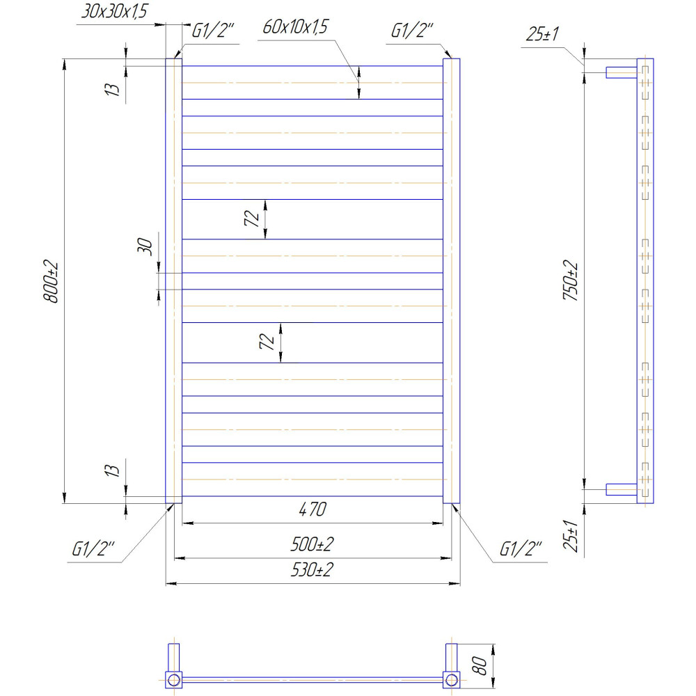 Рушникосушарка "Маріо" Санті 800х530/500. Розміри: висота - 800 мм, ширина - 530 мм, глибина 80 мм, міжцентрова відстань для підключення - 500 мм, діаметр підключення G1/2''. Варіанти підключення: нижнє, діагональне та бічне. Кількість ребер - 8, стояки з квадратного профілю.Виготовлена з полірованої нержавіючої сталі без хромування. Варіанти покриття: полірована або сатин, чорний мат, білий глянець, золото, бронза. Для всесезонної роботи водяну модель можна переобладнати на комбіновану, встановивши ТЕН, рекомендована потужність 300 Вт.Сумісні аксесуари: поворотні полиці та навісні гачки для збільшення функціональності.Рекомендовано підключати рушникосушарку за допомогою кранів Маріо.Гарантія - 50 років в закритій системі опалення, 5 років у централізованій.УВАГА! Через конструкційні особливості перемичок, робочий тиск рушникосушки 9 атмосфер!