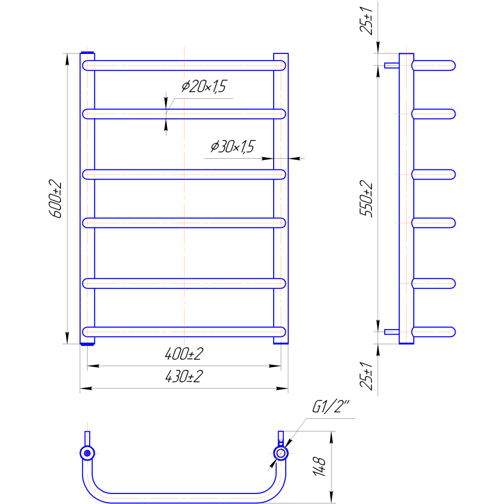 Рушникосушарка "Маріо" Стандарт 600х430/400. Розміри: висота - 600 мм, ширина - 430 мм, глибина 170 мм, міжцентрова відстань для підключення - 400 мм, діаметр підключення G1/2''. Варіанти підключення: нижнє, діагональне та бічне. Кількість ребер - 6, стояки з круглої труби.Виготовлена з полірованої нержавіючої сталі без хромування. Варіанти покриття: полірована або сатин, чорний мат, білий глянець, золото, бронза. Для всесезонної роботи водяну модель можна переобладнати на комбіновану, встановивши ТЕН, рекомендована потужність 120 Вт.Сумісні аксесуари: поворотні полиці та навісні гачки для збільшення функціональності.Рекомендовано підключати рушникосушарку за допомогою кранів Маріо.Гарантія - 50 років в закритій системі опалення, 5 років у централізованій.